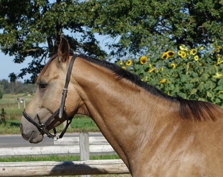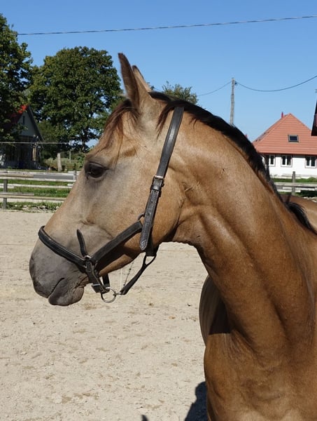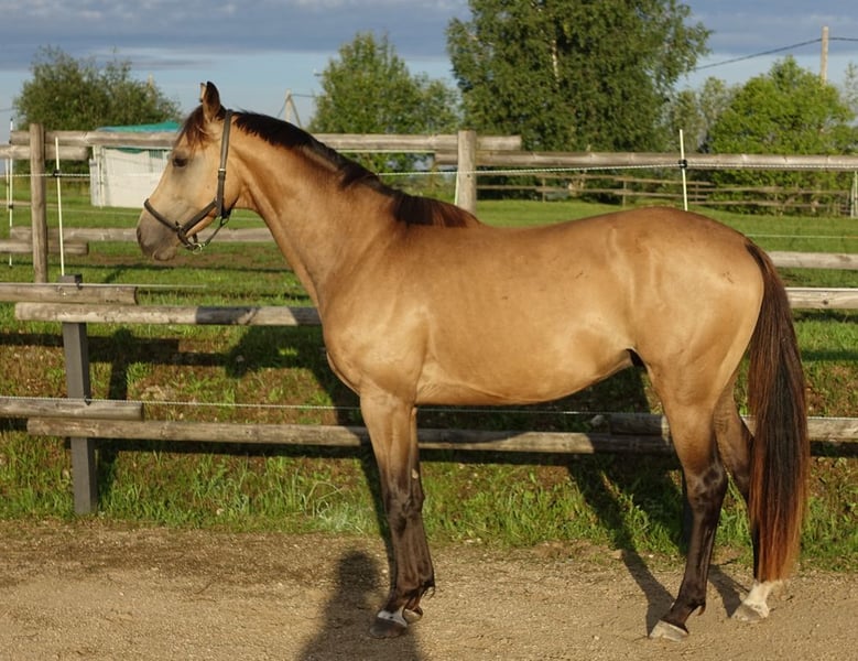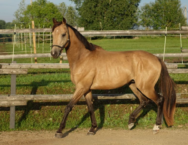 Wonderful buckskin thoroughbred gelding directly from breeder. Sired by Goldmaker xx (RFF The Alchemist); dam Erydana xx was a successful racehorse, damsire famous Jape xx. Born July 2020, 163 cm. A raw diamond for someone looking for a lifetime partner. I see good potential in eventing here- he moves well, he jumps well, has a lot of stamina and is clear in head. Correct conformation with very beautiful head, very good hooves. Has been handled a lot- videos available. Easy with boxing, loading and farriering. Lives together in herd with other stallions and geldings. Has not been saddled yet for not his fault, but my busy time schedule. We will start saddling him soon this spring, grab him before that for less carrots! X-rays from 2024 available. Steht in Estland, direkt vom Züchter- kann problemlos nach Deutschland gebracht werden, die Kosten belaufen sich auf ca. 600-800 Euro. Wir haben etwa 30 Pferde nach Deutschland verkauft. https://www.youtube.com/watch?v=5Cj5CNWwsHY https://www.youtube.com/watch?v=yhMNl8VMAes https://www.youtube.com/watch?v=uUJRFc3HnVc https://sporthorse-data.com/pedigree/gene-krupa-xx anneli.kadakas@gmail.com https://www.facebook.com/reinu.talu