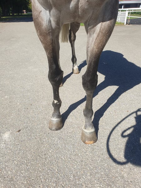 Stamp has finished his racing career; he underwent surgery on a carpal joint. The clinic said he can still walk, but we don't want to put him through that; he has earned his retirement now. He is very well-behaved to ride and will make a very nice leisure horse; he goes anywhere! The price is low due to the cosmetic issue with the carpal joint, but he is not lame, as seen in the videos.