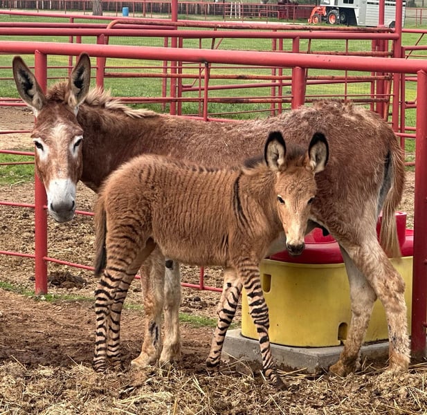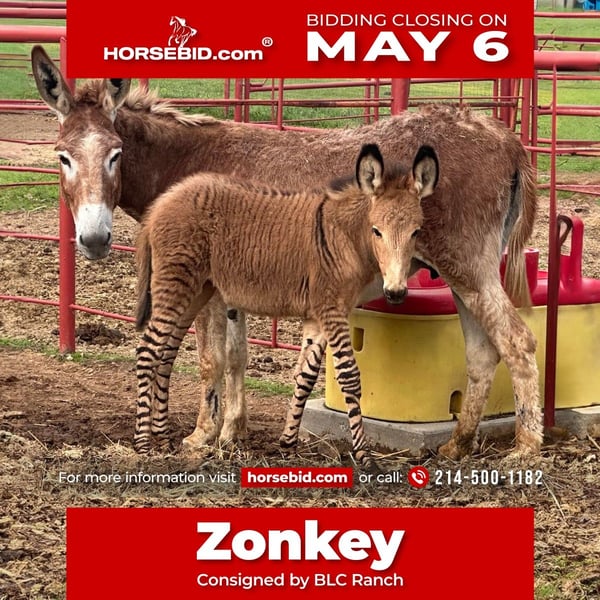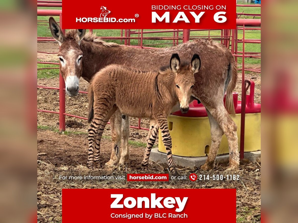 ⚜️ The Elite Spring Classic ⚜️ Happening now thru MONDAY | MAY 6th - Available EXCLUSIVELY on HorseBid's website! For more details and to register visit: www.HorseBid.com CONSIGNOR CONTACT: BLC RANCH 214-500-1182 LOCATION: Grand Saline, TX BREED: ZeDonk REGISTERED: No COLOR: Striped HEIGHT: 00 AGE: Weanling GENDER: Jenny/ZeDonk filly This cute z donk filly and her mother a nice big standard red Jenny. The filly is three months old and has gorgeous markings. Her sire was a Grevy zebra. Grevys are known for their ears, size, and better stripes. The Jenny has had multiple z donk foals and is a good mother. This an awesome opportunity to get a filly that’s ready to train your way. Bong have a clean bill of health and are ready to go. Please call 214-500-1182.