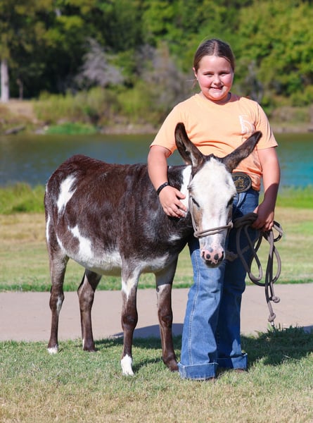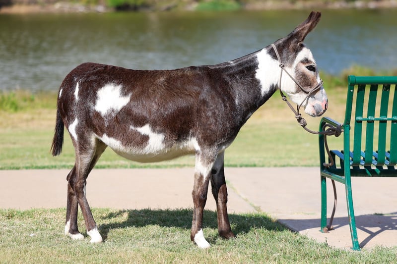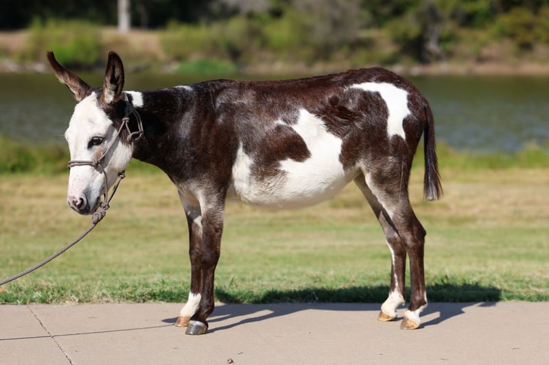 𝓽𝓱𝓮 𝐑𝐈𝐃𝐄𝐑'𝐒 𝓒𝓱𝓸𝓲𝓬𝓮 🐴 𝐏𝐎𝐍𝐘 𝐄𝐃𝐈𝐓𝐈𝐎𝐍 🐴 Happening now thru TUESDAY | NOVEMBER 11th - Available EXCLUSIVELY on Ponybid's website! For more details and to register visit: www.Ponybid.com CONSIGNOR CONTACT: MM Ranch 469-595-6289 LOCATION: Forney, TX BREED: Miniature Donkey REGISTERED: No COLOR: Paint HEIGHT: 34" AGE: 3 GENDER: Jenny 🫏3 yr old miniature black and white paint Jenny. Yes…a paint mini Jenny!!! This is Pookie. Pookie stands 34 inches tall. And again just 3 yrs old. She was hand raised, so she is extra sweet and gentle. Broke to lead, load, stand tied, picks up her feet easily, good for the farrier, easy to catch and handle. She has worn and been used to pack a little. But I would not say she is not broke to ride. (Just cause she is too little for most kids to ride) So no you cannot pack a lot on her BUT she is so cute wearing her little pack saddle around. And looks so cute for pictures. We put the pack saddle on her and put our drinks and lunch in it and packed her through the park. She is a pet. Loves attention. Loves to be around the kids and dogs. Loves her treats. She cannot wait to meet you at the gate to see what you have. She would be a perfect backyard companion or a perfect addition to anyone’s breeding program. ❤️She has no health problems. Excellent feet. Up to date on shots and worming. She is ready to go to her new home to be enjoyed. 🌎We can and will help arrange shipping if needed.