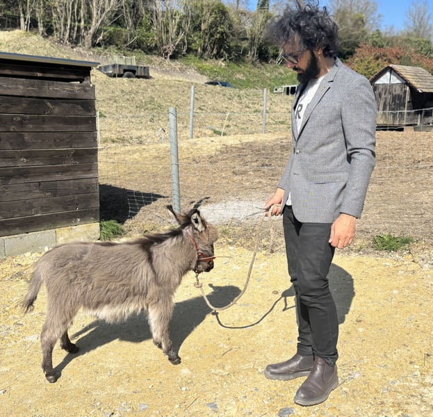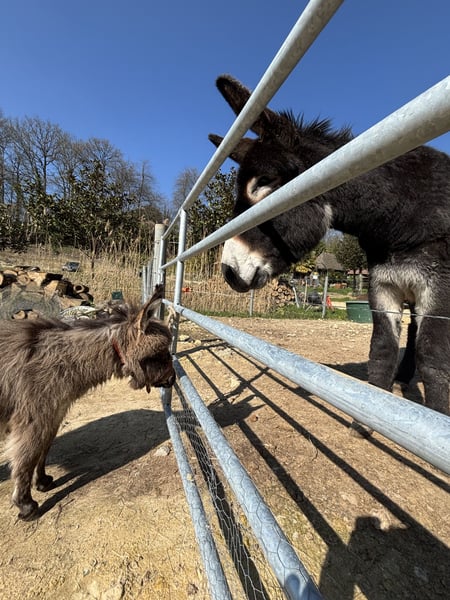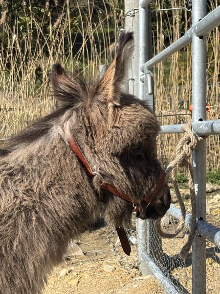PtiBouchon is looking for his forever family A true American Miniature Donkey, already castrated to preserve his adorable personality, currently measures 63 cm at the withers at 6 months old. PtiBouchon is halter-trained and allows handling of his feet. He is comfortable with basic manipulations, but as he is still a baby, it will be up to you to continue his education. He has a rather calm temperament for his age and will be perfect for any activity you wish to introduce, such as animal-assisted therapy walks, training, and small tricks. He has been regularly wormed throughout his growth, and his parents are also well cared for, with all necessary veterinary, farrier, and dental follow-up to ensure their well-being. He has already had his first hoof trim, which went smoothly. He will be sold vaccinated and castrated; this is included in the price. Donkeys are happier when accompanied by another donkey, so you will need to already have a gentle gelding or mare on site to welcome him, or plan to adopt one simultaneously with his arrival.