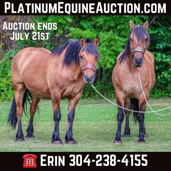 ONLINE AUCTION Place your bids at www.PlatinumEquineAuction.com Starting Bid $3500 Auction ends July 21st, 2024 Need a new saddle? Check out White Rock Saddles on our website or Facebook! YOU ARE BIDDING ON THE PAIR (2 HORSES FOR 1 PRICE) This is “THELMA & LOUISE”, a super versatile, unique, well broke, and pretty team of FJORD QUARTER HORSE CROSSBRED MARES that are full sisters. They are 7 and 8 years old standing 15.1hh. These mares are both extra gentle, anyone can ride or drive them, and they are both friendly and personable. They are thick made with lots of muscle, heart, and style. They have been hitched to all farm machinery and work double or single. They have been shown in the hitch classes in womens pleasure. They have been used on a ranch for wagon rides, they have been in the holiday parades, and on overnight camping trips. They trail ride for any level rider and have been ridden by small children. They move out nice, stop on whoa, back up, and have no issues. They both load, haul, bathe, stand tied to be harnessed, hitched, and groomed, and they are well mannered. This team is traffic safe, super dependable, and ride and drive the same EVERY trip out of the barn. These mares have also been in the unicorn hitch and will work in any position. If you want a super rare team of Fjord crossbred mares, don’t miss out. They are sure footed, fun to ride, easy to drive, and calm. LOcated in Flemingsburg, KY. Contact HH Horses Erin 304-238-4155. ONLINE AUCTION Place your bids at www.PlatinumEquineAuction.com Starting Bid $3500 Auction ends July 21st, 2024 Need a new saddle? Check out White Rock Saddles on our website or Facebook!