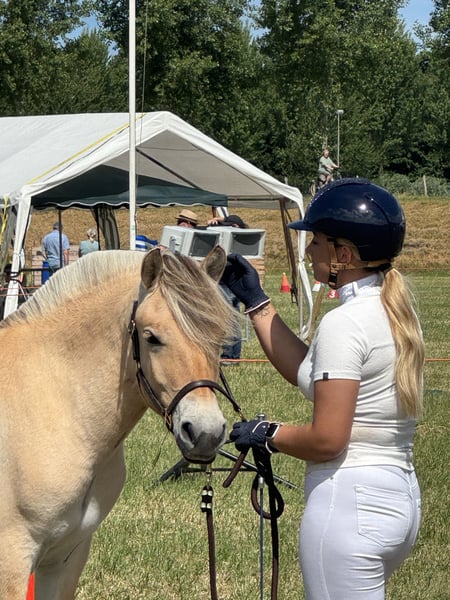 Sehr liebe Fjordpferdestute aus dem Jahrgang 2024 mit einem äußerst angenehmen und mitdenkenden Charakter. Galant311 X Lavi Als Fohlen wurde sie bei der Körung in einer großen Gruppe von Stutfohlen mit 39 Punkten als Erstplatzierte ausgezeichnet. Im Fohlenchampionat, bei dem auch Hengste anwesend waren, wurde sie zur Fohlenchampionesse gekürt. Bei der zentralen Körung erreichte sie den zweiten Platz mit 39,5 Punkten. Im vergangenen Jahr bei der Jahrlingskörung erhielt sie erneut eine Ersteplatzierung mit 38 Punkten. Diese Stute wird also definitiv nicht in der Körung oder im Turniersport zu kurz kommen. Für Züchter äußerst interessant. Sie ist Trägerin des Roan-Farbs und möglicherweise heterozygoter Agouti, was bedeuten könnte, dass sie bei geeigneter Partnerwahl ein Graupferdzeug hervorbringen könnte. Sie geht nur in ein sehr gutes Zuhause und steht keinesfalls in der Weg, daher sollten Schnäppchenjäger keine Anfrage stellen.