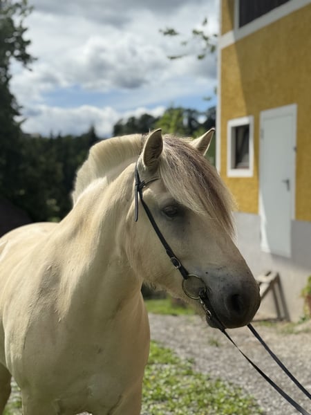 Laurin is a approximately 143 cm tall 5-year-old Fjord horse with a white coat. He was born in 2020 and has been living in our species-appropriate herd since then. In the herd, he is rather dominant. Laurin has been in training for a year now. We started groundwork earlier, so he knows the basics. When riding, he is well-behaved and shows good gaits. He is very sure-footed and loves to go on long, relaxed trail rides. We are not yet as advanced in the riding arena, but he is still in training and is developing every day. Due to his age, he is not suitable for beginners. He is very kind, even with children, and loves to cuddle with them. Laurin needs a consistent but loving and patient owner who spends a lot of time with him regularly. Laurin is a very people-oriented and affectionate horse who enjoys closeness. He is also very well-behaved with the farrier, but he has never been shod as he has good hooves. There have never been any problems with trailer loading either. Laurin can be viewed and tried out for riding by appointment. We are also happy to send current videos upon serious interest. Please feel free to contact us for more information.