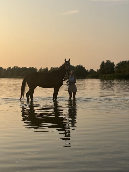 Met veel verdriet heb ik besloten mijn 5 jarige draver ruin Kairos te verkopen. Momenteel wordt hij dressuurmatig doorgereden dit pakt hij goed op. Het is een paard met pit daarom niet voor de onzekere ruiter weggelegd. Aan de hand is hij ontzettend lief. Geef optijd je eigen grenzen aan. Hij houdt van concequentie. Momenteel nu bijna 3 jaar in mijn bezit. Gekocht met 2,5 jaar, zelf zadelmak gemaakt en doorgereden. Hij is verkeersmak, en maakt een leuke sprong. Hier heeft nooit de prioriteit gelegen. Hij kan normaal galloperen en heeft de drafbaan nooit gezien. Kan in een kudde staan. Wil jij met dit fantastische leergierige paard aan de slag! stuur me dan een berichtje wij ontmoeten jou graag! Gaat weg met al zijn toebehoren. De vraagprijs is 4000 euro, maar een goed plekje vindt ik belangrijker.