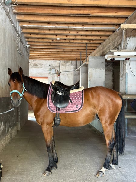 Sky is a small, delicate trotter who has been with us since he was a foal and has never been on the racetrack. He was gently backed at the age of 4 by Martin Wimmer using Parelli methods. He is familiar with groundwork, trail riding, and work in the arena. He is very fearless and always eager to please. Due to his size, he is ideal for gentle ladies or young people and is not a weight carrier. Recently, he hasn’t been worked much due to a lack of time, so he is still fresh. He is accustomed to both open stable and box housing; he currently stands in an open stable and is in a mixed herd, being very social and uncomplicated. He has always been barefoot and has never needed shoes. He is also familiar with loading and is very well-behaved, stepping in without hesitation. A horse with which you can do anything and who is always up for fun (see videos).
