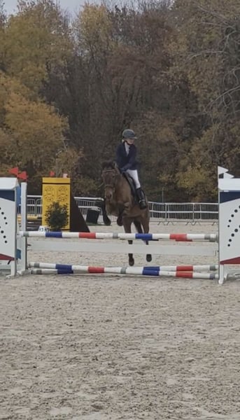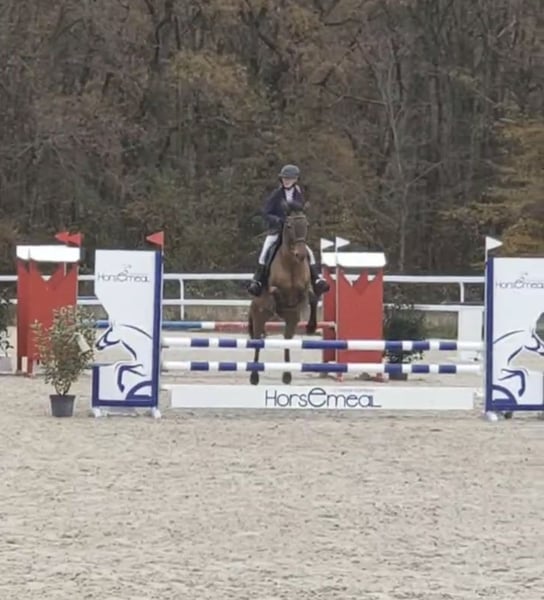 Ponette D – 10 ans – 1m45 - ONC Kaline est polyvalente et agréable, idéale pour du loisir sportif ou un projet évolutif. Déjà sortie en CSO, elle enchaîne 90 cm et peut sans souci aller plus haut avec un peu de travail. Elle a du peps, mais reste respectueuse, sans être dans le sang ni dans le rapport de force. Elle conviendra autant à un cavalier souhaitant progresser qu’à un profil plus confirmé. Elle a déjà vu des obstacles de cross, possède de bonnes bases en dressage et pourrait facilement évoluer en CCE. Tête froide, va toujours de l'autre côté. Habituée à travailler régulièrement en carrière, elle sort aussi très souvent en balade, seule ou en groupe même avec débutants. Elle part sans problème, y compris avec des adultes ou enfants débutants, et reste posée et agréable. Très facile au quotidien, gentille et pratique, c’est une ponette idéale pour une famille, du loisir sportif encadré ou une utilisation club.