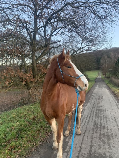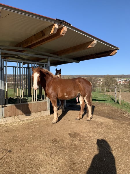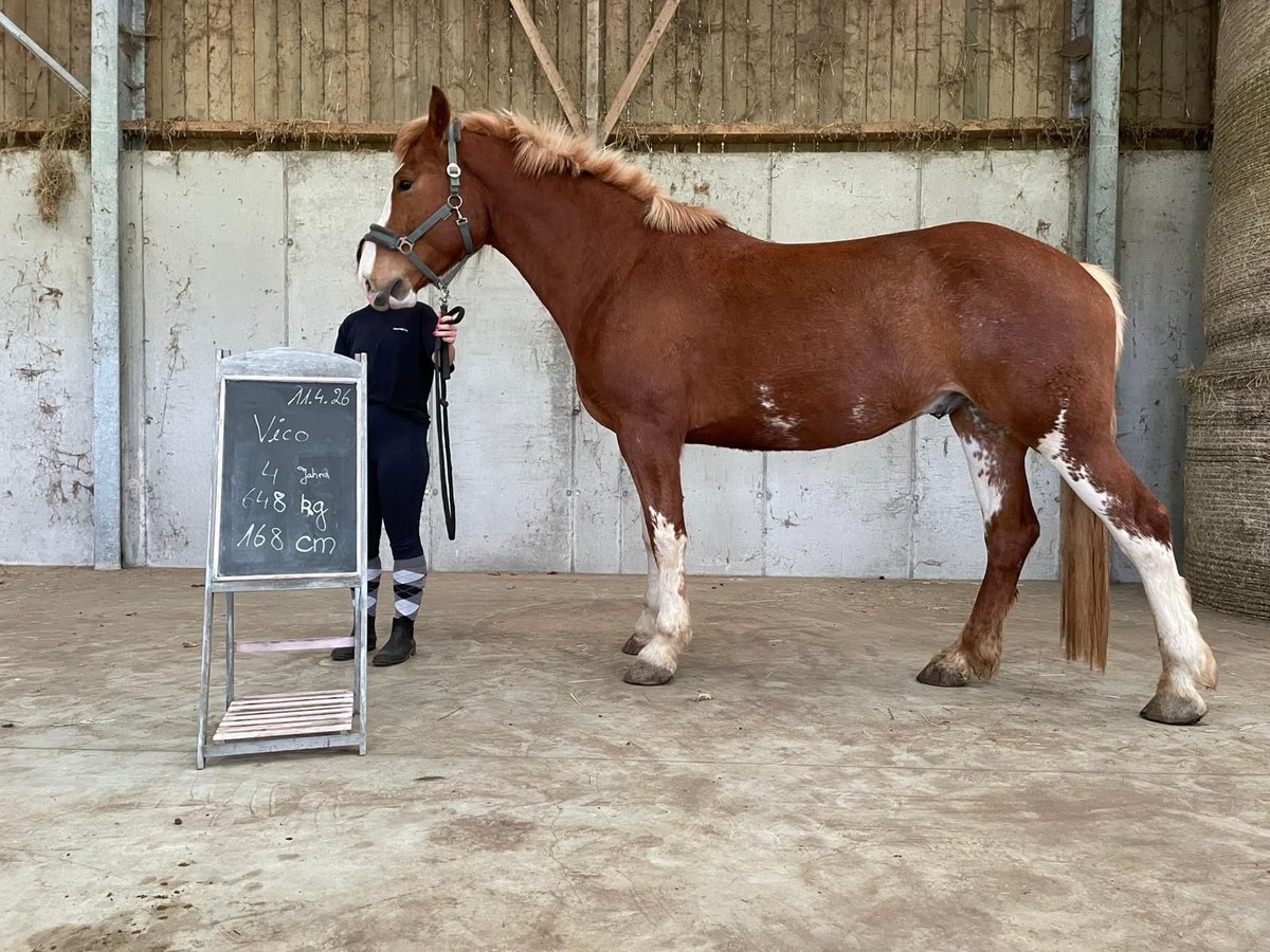 Vico impresses with his solid chestnut color and his good character. He is very willing to work and learns quickly. He has not yet been backed, but he handles being led as a companion horse and is well-behaved during lunging and ground work. The saddle does not impress him either when saddling up or when walking. His only issue arises when people jump, including dismounting from the saddle. Vico is barefoot and lives in a herd. Since he has started head-shaking after weaning from the foal pasture, I would like him to continue this free-range lifestyle, as currently, the head-shaking is not very disruptive. Therefore, I am offering him at a below-market price.