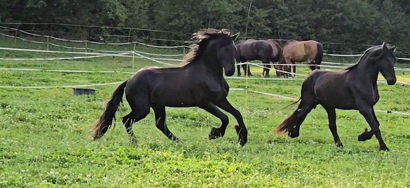 Pozitano z Doliny Ohrnbach – imponujący młody ogier fryzyjski o sercu, odwadze i niezwykłej opanowaniu Rasa: Fryzyjski Rodowód: Haitse 425 × Pier 448 Rok urodzenia: 2021 Wzrost: około 1,67 m Kolor: karej Lokalizacja: 64720 Michelstadt Cena: ... Nasz własnoręcznie wyhodowany fryzyjski ogier Pozitano z Doliny Ohrnbach to prawdziwa perełka wśród młodych koni: piękny, wyrazisty, niesamowicie łagodny i o sercu ze złota. Został od początku pieczołowicie przez nas wychowany i z dużą cierpliwością oraz wyczuciem wyszkolony. Pozitano posiada trzy bardzo dobre podstawowe chody, zawsze wykazuje chęć do nauki i z zaangażowaniem podchodzi do pracy. Mimo swojego ogierowego temperamentu jest niezwykle łagodny w obsłudze, uprzejmy, bezproblemowy i zawsze szuka kontaktu z człowiekiem. Na zawodach regularnie pokazuje swoją odporność nerwową: jest absolutnie niewrażliwy na otoczenie, nie popełnia błędów i w każdej sytuacji jest niezawodny i skupiony. Cieszy się z pracy, nowych ćwiczeń i małych skoków. Również w terenie jest pewny siebie, odważny i zrelaksowany – niezależnie od tego, czy jest z przodu, z tyłu czy w środku, zawsze idzie razem z jeźdźcem. Radzi sobie nawet w wyjątkowych sytuacjach z dużym spokojem: trzepoczące płachty, plandeki, jazda bez uzdy czy specjalne zadania, takie jak stępa, pod siodłem – Pozitano zawsze pozostaje opanowany i godny zaufania. Dlatego świetnie nadaje się także na pokazowe konie. W treningu imponuje chęcią do nauki: opanował podstawowe ćwiczenia, takie jak boczne kroki, traversy, galop z postoju i z kroku, a także zaczyna pięknie się zbierać. Obecnie uczy się skoków z biegu. Jego ogromna pasja do pracy sprawia, że każda sesja jest przyjemnością. Jest kowaloodporny i załadunkowy, przyjazny, jasny w głowie, utalentowany i pełen serca – to wyjątkowy ogier, który każdego dnia zaskakuje i zachwyca. Dla osób poszukujących szczerego, odważnego i wyjątkowego partnera, który zarówno wzrusza emocjonalnie, jak i sportowo błyszczy. Na życzenie może zostać wykastrowany. Film na życzenie.