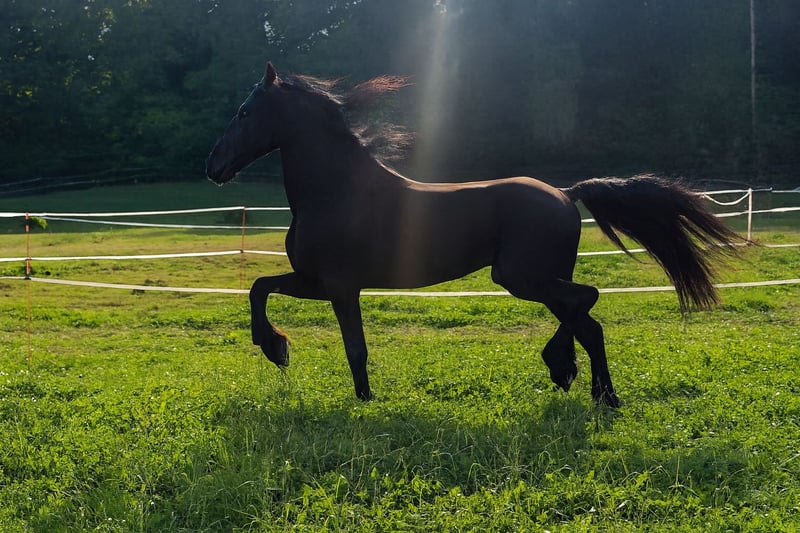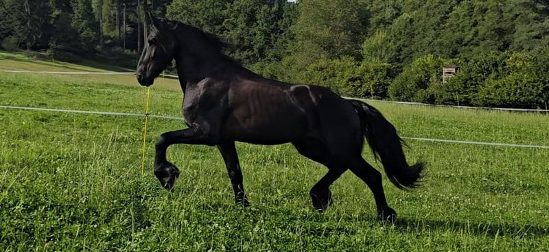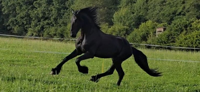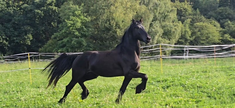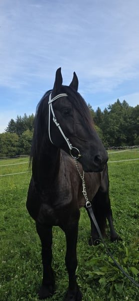 Pozitano from the Ohrnbachtal – an impressive young Friesian stallion with heart, courage, and extraordinary calmness Breed: Friesian Pedigree: Haitse 425 × Pier 448 Year of Birth: 2021 Height: approximately 16.1 hh Color: Black (Rappe) Location: 64720 Michelstadt Price: ... Our self-bred Friesian stallion Pozitano from the Ohrnbachtal is a dream come true: beautiful, expressive, incredibly well-behaved, and with a heart of gold. He was lovingly raised by us and trained with patience and sensitivity. Pozitano possesses three very good basic gaits, consistently shows willingness to learn, and works with special dedication. Despite his stallion genes, he is extremely gentle in handling, polite, uncomplicated, and always seeks closeness to humans. In competitions, he regularly proves his nerve strength: he is completely unfazed by the surroundings, makes no mistakes, and remains reliable and focused in every situation. He enjoys working, learning new movements, and even small jumps. In the terrain, Pozitano is confident, brave, and relaxed – whether in front, behind, or in the middle, he goes everywhere with ease. He handles unusual situations calmly: fluttering capes, tarps, free riding, or special tasks such as piaffe under saddle – Pozitano stays cool and trustworthy at all times. Therefore, he is also an excellent choice as a show horse. In training, he impresses with his eagerness to learn: he masters leg-yields, traverses, canter from walk and halt, and is already beginning to collect beautifully. Flying changes are currently being trained. His great work ethic makes every session a pleasure. He is farrier- and loading-friendly, friendly, clear-minded, talented, and full of heart – a very special stallion that excites every day anew. Ideal for those seeking an honest, brave, and exceptional partner who can touch emotionally and excel in sport. On request, he can be castrated. Video available upon request.