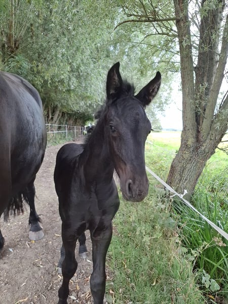 Douglas from the Moon GD Aged 514 days, sport AAA x Alwin 469 sport pref AAA Born on August 4, 2025 Luxurious, light-footed colt, a talented sport horse for the future! Douglas is a friendly foal, and on October 4th, he received a respectable second premium in Nunspeet. It was noted that he is a luxurious, light-footed foal with an elegant head. His mother, due to an accident as a foal, is not in training, but naturally has a strong hindquarters and a friendly, willing character. (The last photo shows his mother). Douglas can leave his mother from February but can also stay until the grazing season begins again.