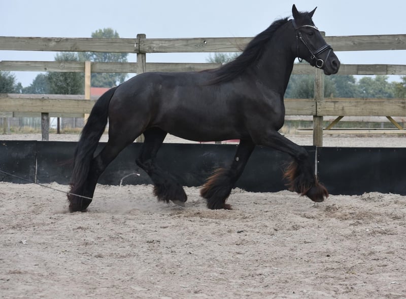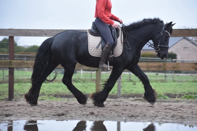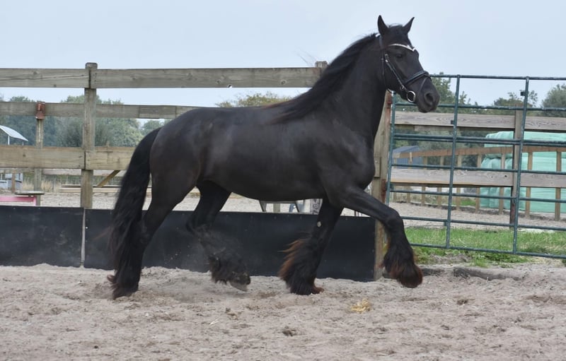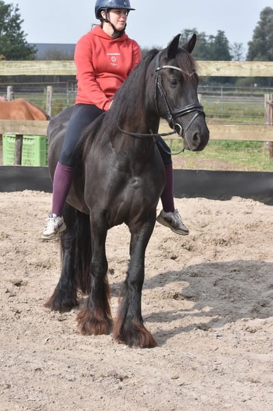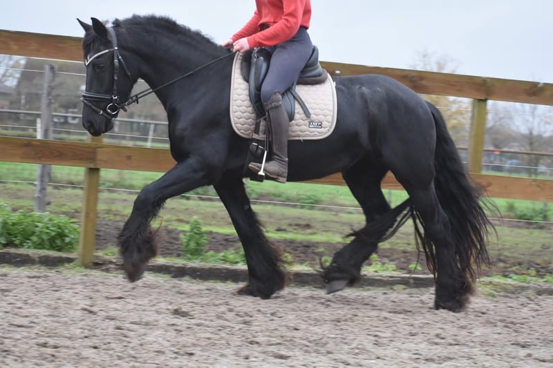 Absolut atemberaubende, äußerst ehrliche und 100 % korrekte Friese Stute Hier ist sie: Marina! (Geburtsname Maria). An ihren ehrlichen, goldglänzenden Augen erkennt man sofort, dass diese Dame einen äußerst zuverlässigen Charakter hat. Dies ist eines der wenigen Pferde, bei dem wirklich nichts zu beanstanden ist. Super ehrlich, ruhig und lieb. Sie verfügt über drei sehr korrekte, hochbeinige, aber dennoch großzügige Gänge, die sie äußerst sporttauglich machen. Sie besitzt einen aktuellen Körbericht inklusive Blutprobe, mit dem sie ohne jegliche Einschränkung für den Sport zugelassen wurde! Sie ist völlig frei von Mängeln. Derzeit ca. 1,58 m groß. Marina wurde am 5. Mai 2021 in Spanien geboren! In den Niederlanden hat sie ein Fohlen bekommen. Die Besitzer haben sich entschieden, das Fohlen zu behalten, und so darf Marina zu einer neuen, liebevollen Besitzerin ziehen. Sie ist bei ihnen für die Kutsche zugelassen, siehe Video. Wir reiten sie regelmäßig dressurmäßig und freizeitmäßig, und das klappt hervorragend – sie hat noch keinen einzigen falschen Schritt gemacht. Dies ist eine schwarze Perle. Ein echtes Unikat.