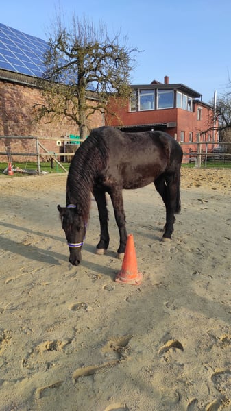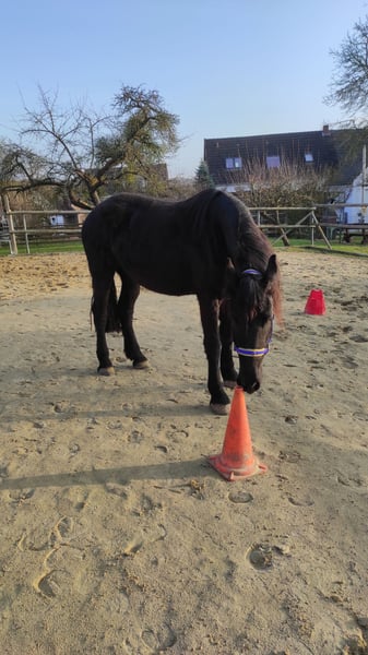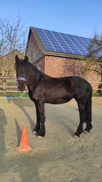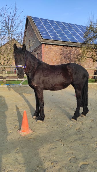 Zum Verkauf steht unsere ausdrucksstarke, noch nicht ganz 4 Jahre junge, Friesenstute "Thalia". "Thalia" ist eine langbeinige Schönheit, die ihrer vollen Entfaltung noch entgegensieht. Sie wurde von uns, nach Übernahme von Züchter, seit nunmehr ca. 3 Jahren liebevoll in einer kleinen Herde großgezogen. So fand "Thalia" bei uns, was sie für ihre Entwicklung nach Abgabe durch den Züchter brauchte: Einen Familienverband bestehend aus einem Sicherheit vermittelnden Herdenchef, einer ruhigen & gelassenen Friesenstute sowie deren Sohn, der "Thalia" ein wohleigener, großer Bruder ist. "Thalia" lebt mit Box & Paddockhaltung, hat ganzjährig Auslauf, frische Luft & Tageslicht. Die Fütterung erfolgt 24/7 nach festen Zeiten. "Thalia" lernte bei uns nicht nur das sog. Fohlen-ABC, sie kennt auch diverse Ausrüstungsgegenstände sowie Bodenarbeit. Auch an der Longe zeigt die sich brav & motiviert. "Thalia" ist barhuf, wird regelmäßig von einer zertifizierten Huforthopädin bearbeitet, was sie ohne Probleme ordentlich erledigt. Regelmäßig wurde sie sowohl den TA, als auch dem ZA vorgestellt. "Thalia" ist gechipt, geimpft & wird regelmäßig entwurmt. Sie hat keine Ekzeme, keine Mauke, keine Raspe oder ähnlich andere Erkrankungen. Einzig Getreide verträgt sie "noch" nicht gut, weshalb wir bei "Thalia" auf getreidearme/-freie Zusatznahrung achten. "Thalia" ist ein roher Diamant, die ihre volle Schönheit, Pracht & Leistungsvielfalt erst noch entfallen wird. Ihre Anlagen sind jedoch heute schon sehr gut zu erkennen. Wir suchen für "Thalia" ein passendes Zuhause, ohne zeitlichen Druck. Bevorzugt wird "Thalia" in friesenerfahrenen Hände abgegeben, die ebenfalls die notwendige fachliche Kompetenz zur weiteren Förderung & Ausbildung mitbringen. Haben wir Ihr Interesse geweckt? Dann kontaktieren Sie uns gerne für weitere Fragen und/oder einen Besichtigungstermin. Es handelt sich um einen Privatverkauf. Es gelten insofern die üblichen Bestimmungen zur Sachmängel-Haftung, Gewährleistung & Garantie (= Ausschluss).