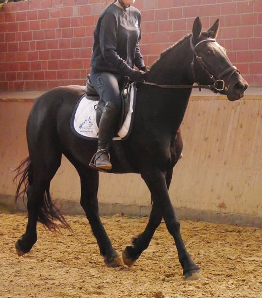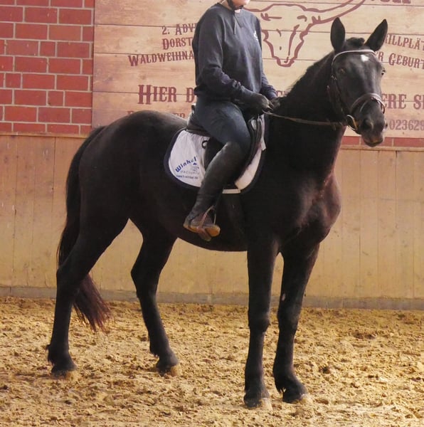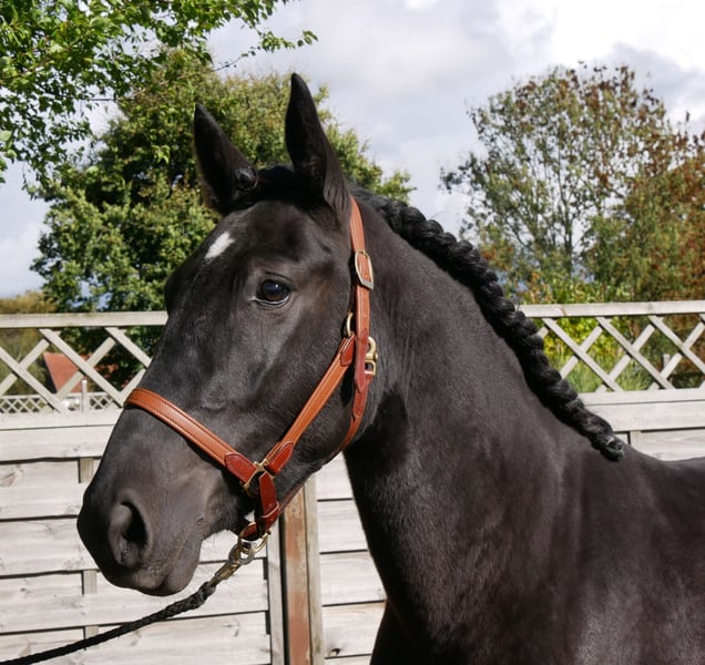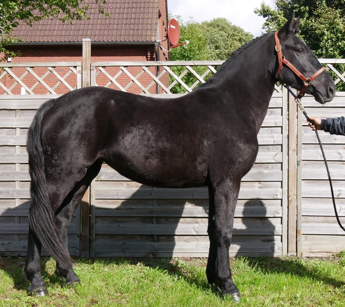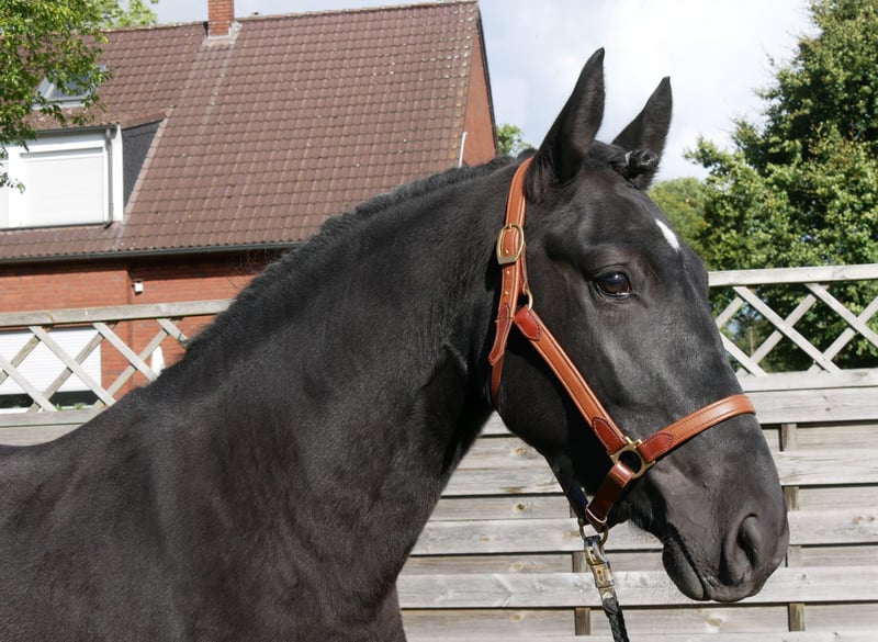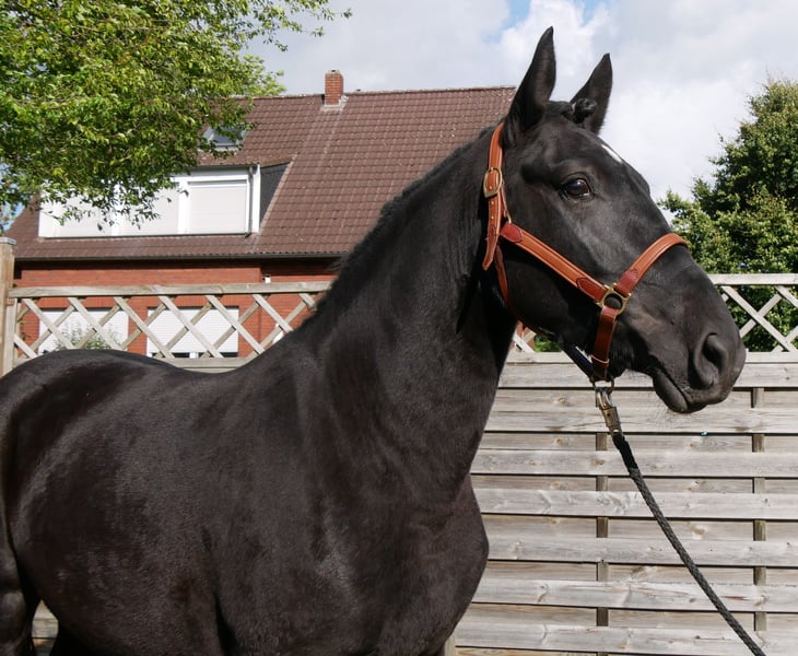 Name: Ruffian Age: born 2021 Gender: Mare Height: 154 cm Training level: ridden for leisure This beautiful black mare is a real eye-catcher! She is fearless, well-behaved in handling, and has been ridden in the field, on the flat, and in the arena. For more information, call 0176 62495567.