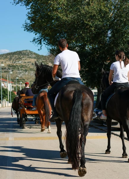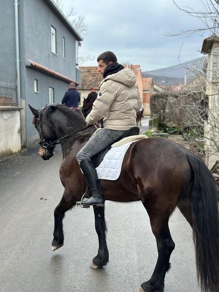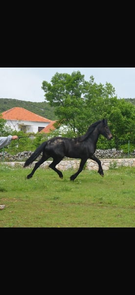 Mare for sale, Friesian × KWPN cross, born in Slovenia. Turned 5 years old on April 2, 2026, height 171 cm. Studbook registered (main book). Regularly vaccinated, never shod, consistently barefoot trimmed. Has participated in various events, goes out alone on trails, accustomed to living in a herd and in a free-run stable. Loads into a trailer and is comfortable with water. She is extremely well-mannered and kind-natured, very calm and easy to handle. She still needs a bit more experience under saddle, but with a few more miles she could be suitable for a beginner or a child. Price: €5000, adjustment possible as a good home is the priority. Located in Croatia ( Dugopolje). For more information, WhatsApp or call: +385 91 782 3581