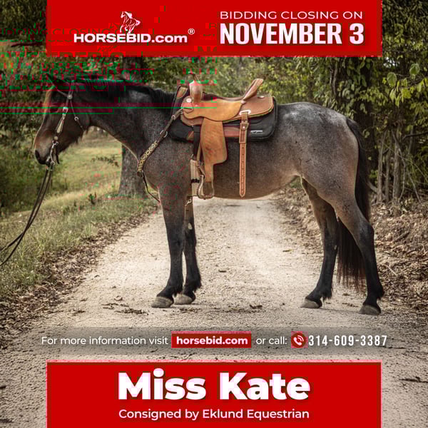 ⚜️𝐓𝐇𝐄 𝐅𝐀𝐋𝐋 𝐇𝐄𝐑𝐈𝐓𝐀𝐆𝐄 𝐂𝐋𝐀𝐒𝐒𝐈𝐂⚜️ Happening now thru MONDAY | NOVEMBER 3rd - Available EXCLUSIVELY on HorseBid's website! For more details and to register visit: www.Horsebid.com CONSIGNOR CONTACT: Eklund Equestrian 314-609-3387 LOCATION: St Clair, MO BREED: Friesian cross REGISTERED: No COLOR: Bay Roan HEIGHT: 15.3 AGE: 5 GENDER: Mare Miss Kate is a beautiful Friesan cross mare with an exceptional temperament and will fit any kind of rider. Miss Kate has perfect ground manners and are always a pleasure to handle. Miss Kate is calm and steady in all kinds of situations. Rides just as well for a child as for an adult. Very family/lesson friendly horse. Miss Kate rides just as well Western as English and is very reliable on the trail. Miss Kate has pushed cattle as well as been used for English dressage and jumping lessons. Miss Kate is very sound and has clean legs. No cuts, scars or blemishes. Miss Kate is located in St Clair, MO and we offer free board and training within a reasonable time frame after purchase until shipping arrangements can be made.