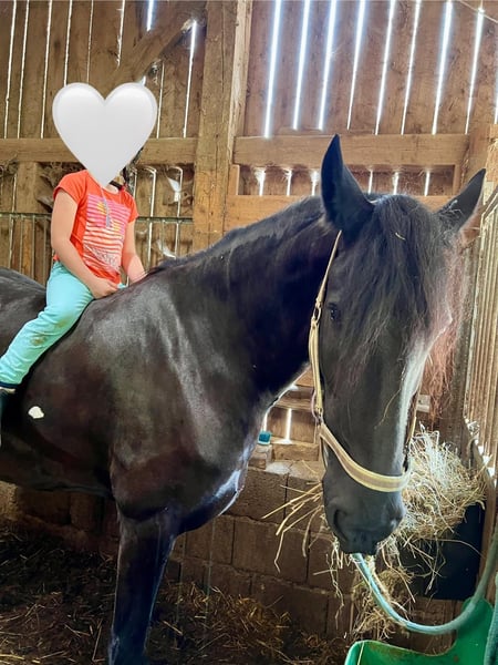 For sale is this 6-year-old Friesian mare with full papers, born on May 10, 2019. Lenya, affectionately called Leni by us, is a very friendly and lovable mare. Whether approaching her in the pasture or in the stable, she always greets you warmly. Once she has truly built trust, she will go anywhere with you. She is always motivated in work and eager to please. She especially enjoys and is highly motivated during groundwork and free work. She has begun to learn the Spanish walk and shows preliminary movements for the Piaffe. Additionally, she can be guided to park herself as an aid for mounting and responds well to the command "turn around." Leni’s subtle body language allows for lightness and joy in her work, making interactions with her very pleasant. Leni was trained at Naturalhorsing in Neuhaus. However, she has not been ridden for the past six months. Thanks to her open and honest nature, we can also envision her as a breeding mare. We would love for Leni to find a home where she can continue to be kept within a herd. It would be wonderful if someone were looking for a warm-hearted, lifelong leisure partner.