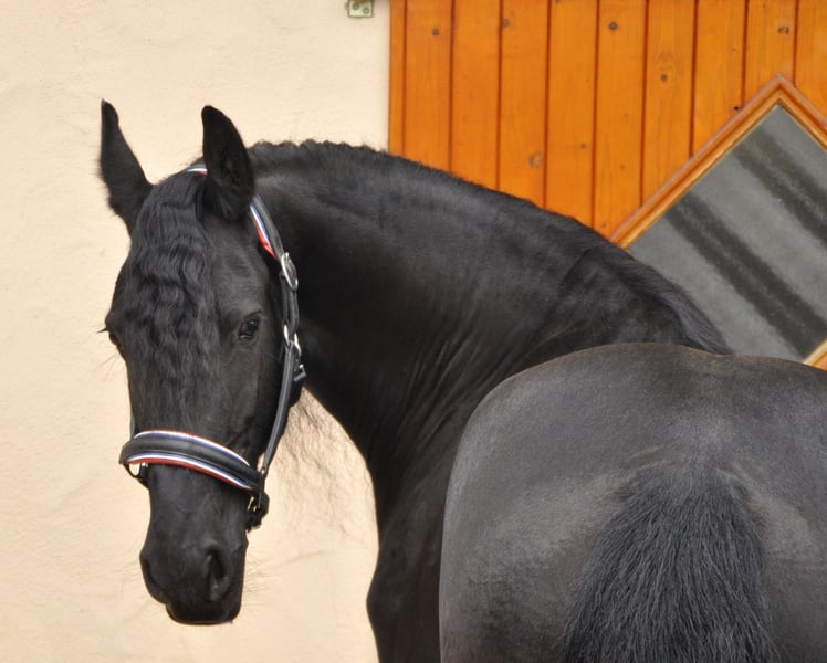 A very sweet and tall Friesian mare from the Netherlands with a beautiful, flowing mane! She has correct conformation, a stunning small head, and her temperament is simply a dream. She does not exhibit typical mare behavior at all, making her a very pleasant horse to handle. Extremely gentle in her interactions—she is calm and self-assured. Under saddle, she displays a pleasant willingness; she always works well with her rider and is fearless. She has been ridden in the three gaits. If you are looking for an extraordinary and unique mare, here she is. This year, she had her first foal, which was very uncomplicated. She was also a very loving mother. Please contact us exclusively by phone for inquiries.