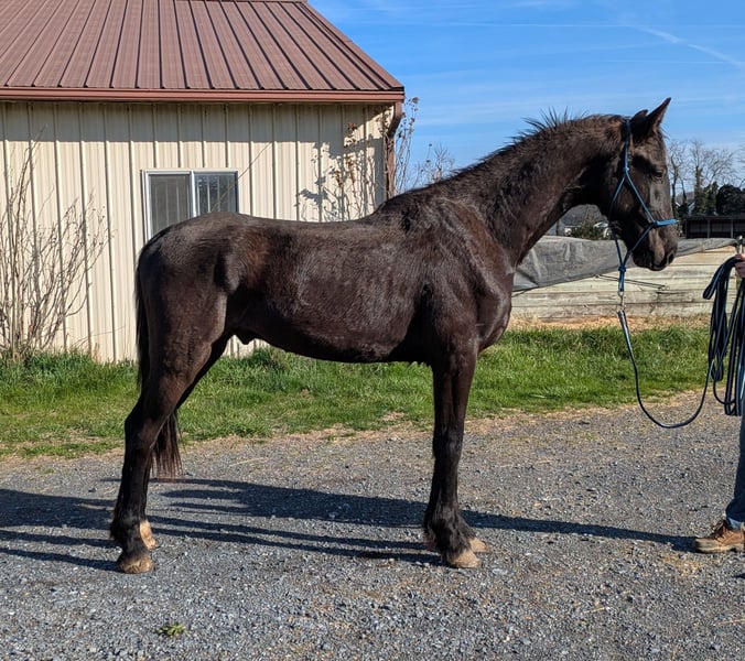 Introducing Sir Dunkin for your consideration!👀🏡 Bridgewater VA Coming 2 year old, ~16hh, Friesian cross gelding. UTD on vaccines and has a current coggins. Dunkin was rescued 2 months ago and has been in training for 1 month now. He has come a long way in his training and has most of the basics down. He is turning out to be a very cool guy and would be a great project for an experienced rider working with a trainer. He is very sweet, intelligent, and handsome!🤩 He thinks everything through and even though he has some firm boundaries, I have yet to find something that he refuses to do. With time, patience and once you have his trust he is willing to try just about anything. He would make a ✨great dressage prospect and is super athletic! He has lovely movements with lots of suspension and flash.✨ While he is safe to handle, he does need an experienced handler due to the fact that he is young and green. He needs someone who knows what they are doing when it comes to youngsters and someone who knows when to push and when to take the pressure off. He is the sweetest boy and always tries his best. You can see his entire journey on my social media Journey of a Hart Horse. He is one that I wish I could keep in my personal herd!! Message me for more information/videos.
