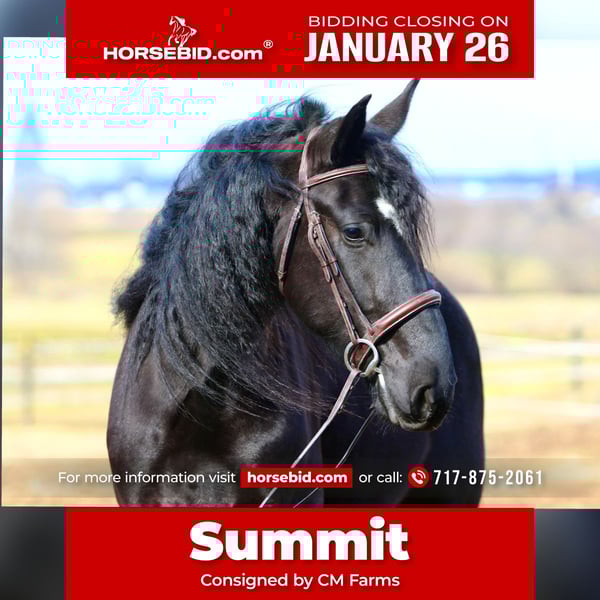 𝐉𝐀𝐍𝐔𝐀𝐑𝐘 ⭐️𝑨𝒍𝒍 𝑺𝒕𝒂𝒓 𝑳𝒊𝒏𝒆𝒖𝒑⭐️ Happening now thru MONDAY | JANUARY 26th - Available EXCLUSIVELY on HorseBid's website! For more details and to register visit: www.Horsebid.com CONSIGNOR CONTACT: CM Farms 717-875-2061 LOCATION: Gap, PA BREED: Friesian/Perch REGISTERED: No REGISTERED NAME: Summit COLOR: Black HEIGHT: 16-16.1 AGE: 4 GENDER: Gelding Meet Summit! This gelding is a 4-year-old, jet-black Friesian/Percheron cross with hair for days and an “in-your-pocket” personality. He stands right around 16–16.1 hh and is put together beautifully, with a solid brain to match. More fondly known around the barn as “Baby Summit,” he’s the biggest lovebug and still in that lanky baby stage of growing. Despite his young age, Summit acts like he’s been around the sun 100 times—he’s truly as quiet and safe as they come. Seriously, you can canter him around bareback on a loose rein while shaking a flag on his back, and he’ll just carry on. He rides Western and English, drives, and even lays down on command! This boy is precious in every way, and we want the very best home for our Baby Summit. Under saddle, Summit has the basics down, and if you can hold the reins, you can ride him. He’s the definition of safe and quiet, suitable for a wide variety of riders. He takes care of everyone who’s sat on him, and I don’t think being naughty or disobedient is even in his DNA. His favorite gait is probably moseying around on a loose rein, but he’ll pick up and put in the work when asked. He’s never had any other answer than yes—he wants to please his person and is so chill and willing that he’ll go along with whatever craziness you throw at him. He has been thoroughly desensitized to tarps, flags, smoke, dogs, kids, other farm animals, equipment, traffic, and just about everything else you can think of. He’s unflappable, with a confidence most horses take years to develop. He’s an easy ride in every way—extremely comfortable in all three gaits, responsive to aids, and able to take a joke. Throw that friend who’s never ridden on him, the nervous rider, or even granny out for a hack—Summit is reliable and safe. He will not disappoint! On the trail, Summit is equally amazing. He enjoys getting out to experience nature with his person and his horse buddies. Load him on the trailer, and he’ll unload anywhere you take him as the same steady boy, just happy to be included. He’s seen everything from wildlife, bikers, and hikers to traffic, creeks, winding wooded trails, and open fields—and he takes it all in stride. He’ll lead the group or bring up the rear, never in a hurry and never getting worked up. He’s the kind of horse you can crack a cold one on and leave your worries at home with. A fun, trustworthy ride you can drop the reins on and canter through the fields. Summit is the same horse every time you pull him out, and he has an incredibly bright future. In the barn, Summit is a big baby in the best way. He would live in your pocket if he could, and once he bonds with you, he’ll happily rummage around looking for a treat. He stands like a gentleman on the ties for grooming, bathing, and tacking up—or spend a couple of hours giving him a spa day and braids, and he’ll love every second. He will quite literally stand next to you while you use power tools (watch the video 🤣) just to be close and give moral support. He’s curious and friendly while always remaining respectful, and he’s a joy to handle. Summit doesn’t have a mean bone in his body, and we absolutely adore him. He makes the best barn mascot and is truly everyone’s favorite guy. If you’ve been looking for that special young horse who will love you as much as you love him, don’t miss out on Summit!