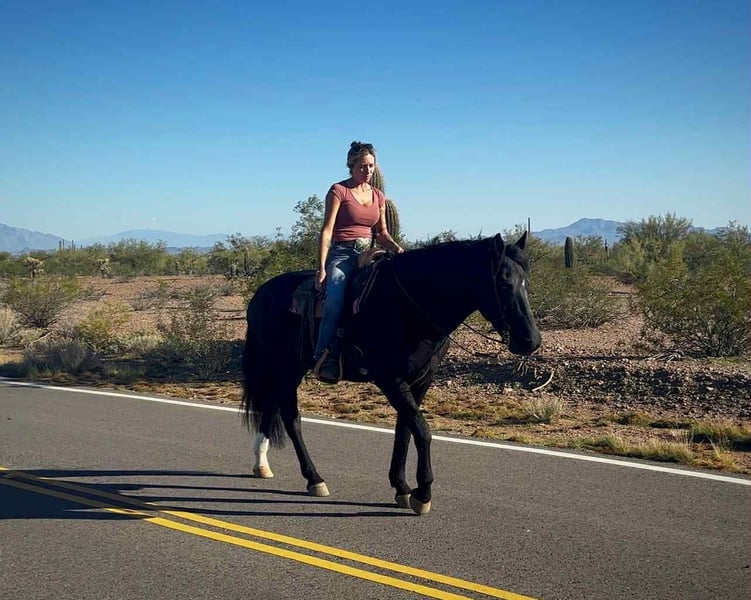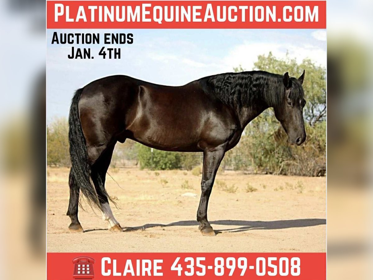 ONLINE AUCTION Place your bids at www.PlatinumEquineAuction.com Starting Bid $3500 Auction ends January 4th, 2025 Need a new saddle? Check out White Rock Saddles on our website or Facebook Beauty, brains and versatility… Odie has it all! This sweet gelding is a 6 year old Friesian QH cross gelding standing a stout 15.1 hands tall. He has a stunning jet black coat and turns heads everywhere he goes. Odie is the type of horse that wants to be your best friend, he has an in your pocket personality and loves getting attention and being loved on. He’ll be the first one to greet you at the gate! Odie has done a little of everything. He has roped and dragged the dummy, pushed cattle, given riding lessons, trail rides and even started riding English. He also rides bareback and is very comfortable with his smooth gaits. Out on the trails Odie is confident and happy to go wherever he is pointed. He will cross brush and logs, go up and down the washes and is also comfortable on the streets as well. He has been ridden out alone as well as in groups. He is not a barn or buddy sour horse at all. Odie is gentle and safe, taking care of his rider in all environments. He has been exposed to tractors, dogs, traffic, and all the crazy things that come with small children such as bikes and mini four wheelers being driven through the barn aisle. On the ground Odie has great ground manners. He stands tied quietly, loves baths, good for the vet and farrier and loads and hauls nicely. He has no vices and is an easy keeper and requires no maintenance. Odie is ready to find his own adventure partner and best friend, he will give you 100% of his heart each and every day! Please feel free to call or text Claire Siebols at 435-899-0508 with any questions about this sweet boy! He is located in Marana, Arizona and we are also happy to help arrange transport anywhere needed! ONLINE AUCTION Place your bids at www.PlatinumEquineAuction.com Starting Bid $3500 Auction ends January 4th, 2025 Need a new saddle? Check out White Rock Saddles on our website or Facebook