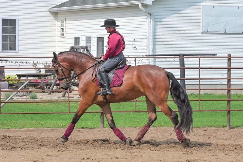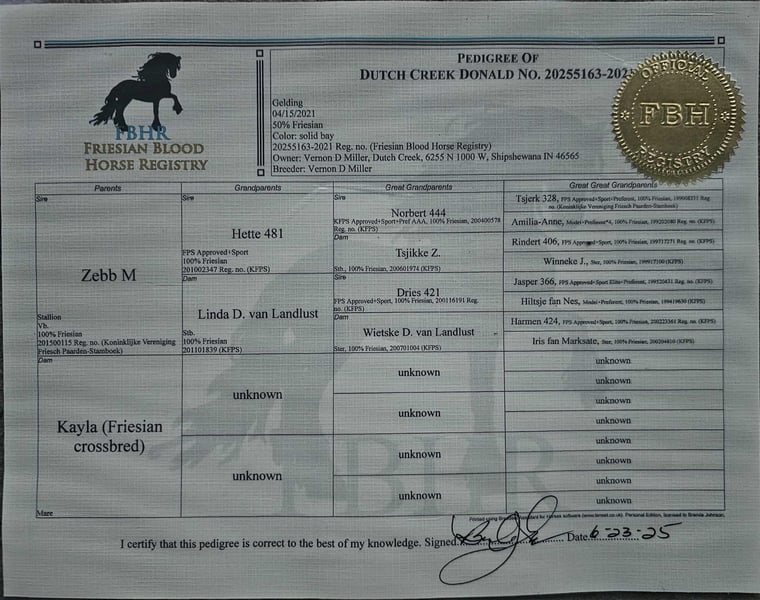 ONLINE AUCTION Place your bids at www.PlatinumEquineAuction.com Starting Bid $3500 Auction ends November 2nd, 2025 Need a new saddle? Check out White Rock Saddles on our website or Facebook One look at Donald is all it takes to confirm every reason why Friesians have been known as royal horses. He is the definition of elegance with the power to perform. Donald is a 4 year old FBHR registered Friesian cross gelding who stands 16.2h, wears a size 3 shoe, and weighs in at approximately 1,400 lbs. He is an outstanding show prospect who has all of the potential in the world to excel in English events. Donald has been exposed to the sights on trails, obstacles in the arena, and even the hustle and bustle of small town life. He is thoroughly desensitized, and is ready to go on in his training. Donald has been started in dressage and already shows so much natural talent. He is such a beautiful mover that even people, who are inexperienced with horses, can see the raw ability that he has. Donald has been ridden extensively in both English and Western tack, and has an excellent foundation in his training in both disciplines. We believe that this makes him so much more well-rounded and versatile for his next riding partner. Donald is a very forward mover, with an impressive extended trot. We feel that he would be best suited for someone who is intermediate to advanced in their showing and riding ability, or someone who is paired with a trainer. Donald could easily be paired with a beginner adult rider, with the aid of a trainer. Donald is sired by Zebb M a purebred Friesian Stallion, and is out of a sporthorse mare who was 50% Friesian, thus making this stunning gelding 75% Friesian. Whether you have a preference for English or Western discipline, we believe that Donald will excel in Dressage or Western Dressage. If kept in training, he could also be very competitive in jumping, eventing, or equitation. Donald handles traffic well, and is not bothered in the least by all of the distractions you typically see when driving through a small town. He crosses water without hesitation, gracefully walks over logs in a trail pattern or over downed timber out on the trail. He has been ridden around large and small livestock as well as poultry, and has also been exposed to wildlife in fields and on trails. When doing arena work, Donald has been ridden in indoor and outdoor arenas, handling both with confidence. He has very impressive agility, and is capable of adapting to different types of footing with ease. You can expect the same ride every time you mount up, as Donald is consistent in his performance even with extended time off. He is honest, you will have no need to worry about hump or buck, even when he is fresh. Donald is well mannered and does wonderful whether he is turned out in the paddock or kept stalled. When turned out, he gets along well with pasture mates and is easy to catch. Donald stands tied, cross ties, is a gentleman for the farrier and veterinarian, clips easily, and stands perfectly to be braided. He stands quietly to be tacked up, for polo wraps, and also stands for the mounting block. I am happy to speak with you or your trainer to ensure that Donald is the perfect fit for you. He will come with a current negative coggins and a Pre-purchase exam from my veterinarian. If you are interested in meeting Donald or have any questions prior to the auction ending, please call Edwin Raber at 319-283-0616. Located in Fairbank, IA. ONLINE AUCTION Place your bids at www.PlatinumEquineAuction.com Starting Bid $3500 Auction ends November 2nd, 2025 Need a new saddle? Check out White Rock Saddles on our website or Facebook