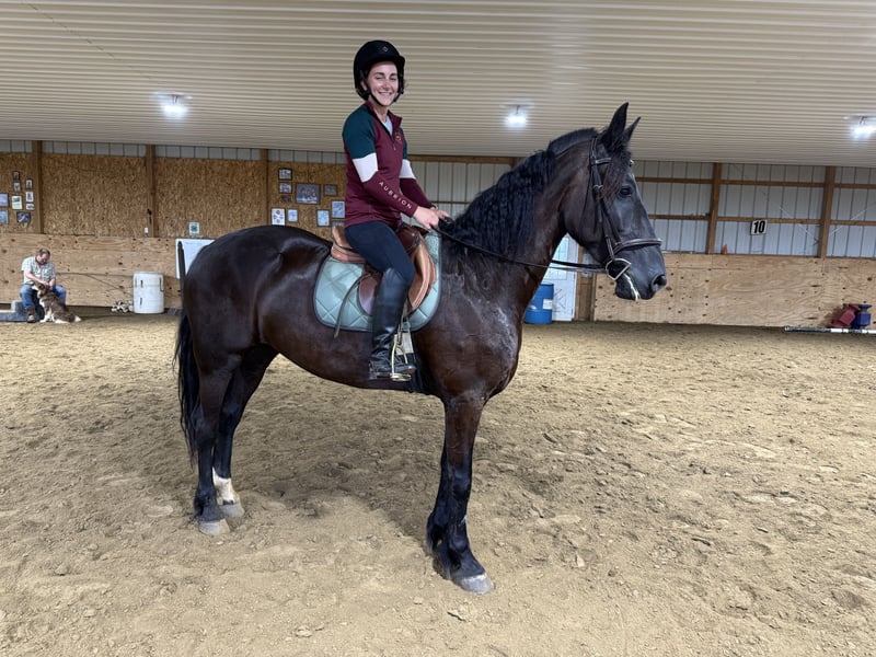 ⚜️𝐃𝐄𝐑 𝐅𝐀𝐋𝐋 𝐇𝐄𝐑𝐈𝐓𝐀𝐆𝐄 𝐒𝐂𝐇𝐋𝐄𝐒𝐒𝐄𝐑 ⚜️ Läuft jetzt bis MONTAG | 3. NOVEMBER – Nur exklusiv auf HorseBid's Website verfügbar! Für weitere Details und zur Anmeldung besuchen Sie bitte: www.Horsebid.com VERKAUFERKONTAKT: Wolcott’s Versatility Horses and Training 585-734-0169 STANDORT: Warsaw, NY RASSE: Friesian Sporthorse Zugelassen: Ja Zugelassener Name: Bonnie and Clyde FARBE: Schwarz Höhe: 16,3 hh Alter: 5 Jahre Geschlecht: Wallach Vorstellung von Bonnie & Clyde, einem eingetragenen, perfekt aufeinander abgestimmten Friesian Sporthorse-Paar für Kutschfahrten. Bonnie und Clyde sind perfekte Beispiele dafür, wie ein Team aussehen sollte. Ihre Bewegungen und ihr Selbsthaltung sprechen für sich. Ob beim Fahren, Roman-Riding oder auf der Weide – dieses Team ist bereit für den Turniersport, Zeremonien oder ein Leben voller eleganter Fahr- und Reitgenüsse! Bonnie ist eine 5-jährige Stute, Clyde ein 4-jähriger Wallach. Sie sind Vollgeschwister und stehen bei 16,3 hh! Dieses Team ist das Rundum-Paket. Sie reiten sehr gut in der Arena und auf dem Trail. Sie arbeiten auch allein, ohne sich nach dem anderen zu rufen. Obwohl sie ihr ganzes Leben lang zusammen sind, sind sie nicht buddy-sour! Bonnie und Clyde haben bereits an vielen Shows, Clinics, Dressurtrainings und Hindernisparcours teilgenommen – alles meisterten sie mit Leichtigkeit! Beide verfügen über eine sehr geschmeidige W/T/C-Galopp in der Arena und draußen! Sie wurden für Reitstunden von Kindern bis Erwachsenen genutzt; jeder kommt gut mit ihnen zurecht. Die Kinder nehmen sie alleine auf den Hindernisparcours oder den Trail mit! Sie überwinden Wasser, Brücken und alle Hindernisse problemlos. Beim Fahren sind sie auf verschiedenste Kutschen- und Wagenarten trainiert und haben sich nie gestört. Wir haben sie für Kutschfahrten auf dem Hof und außerhalb eingesetzt, und sie agierten wie ein erfahrenes Team! Sie sind verkehrssicher und haben schon viele Fahrten an der Straße mit LKWs und Autos gemeistert. Im Stall sind sie sehr ruhig; sie lassen sich problemlos putzen, scheren, waschen und vom Tierarzt behandeln. Bonnie und Clyde sind 100 % gesund und frei von Vorerkrankungen oder schlechten Gewohnheiten! Für weitere Informationen wenden Sie sich bitte an Dayton unter 585-734-0169. Standort: Warsaw, NY!