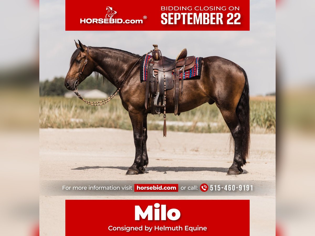 🍁𝒕𝒉𝒆 𝐅𝐀𝐋𝐋 𝑺𝒑𝒆𝒄𝒕𝒂𝒄𝒖𝒍𝒂𝒓🍁 Happening now thru MONDAY | SEPTEMBER 22nd - Available EXCLUSIVELY on HorseBid's website! For more details and to register visit: www.Horsebid.com CONSIGNOR CONTACT: Helmuth Equine 515-460-9191 LOCATION: Ames, IA BREED: Friesian X Quarter Horse REGISTERED: No REGISTERED NAME: Milo COLOR: Bay HEIGHT: 16+ AGE: 5 GENDER: Gelding Meet Milo, a drop dead gorgeous 5 year old Friesian X Quarter Horse gelding standing over 16 hands. Milo is broke to both ride and drive, and he’s willing to do anything you ask of him. He walks, trots, and canters beautifully, picking up both leads with ease. If you’re searching for that big drafty type with a true Quarter Horse jog, you’ve found your match. He will lope circles on a loose rein, rides nicely forward in English tack, and is ready to show in dressage. Milo responds very well to leg aids and has a calm, sensitive, and willing temperament. He drives confidently single, has worked with all types of farm equipment, and has experience in multiple hitches. Milo will cross water, go up and down hills, and ride out alone or in a group. Point him down any trail, and he’ll happily take you there. He would also excel in western dressage and ranch horse shows. His demeanor is the type that stays with you and always tuned in and ready to do what’s asked. With his excellent work ethic, you can trail ride one day and ride a dressage test the next. Milo gets along well with other horses, is easy to catch, and can live inside or outside. He requires no special maintenance in any shape or form. He is easy on the eyes with his striking looks and confirmation. If you’re looking for a big, solid partner who can do any discipline and enjoy it, Milo is the one.