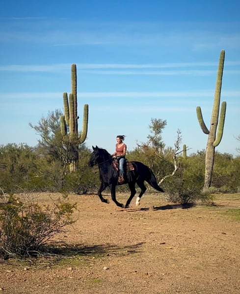 🎄𝐓𝐇𝐄 𝑯𝒐𝒍𝒊𝒅𝒂𝒚 𝐂𝐋𝐀𝐒𝐒𝐈𝐂🎄 Happening now thru MONDAY | DECEMBER 15th - Available EXCLUSIVELY on HorseBid's website! For more details and to register visit: www.Horsebid.com CONSIGNOR CONTACT: 11/11 Equine 435-899-0508 LOCATION: Marana, AZ BREED: Friesian Cross REGISTERED: No COLOR: Black HEIGHT: 15.1 AGE: 6 GENDER: Gelding Beauty, brains and versatility… Odie has it all! This sweet gelding is a 6 year old friesian QH cross gelding standing a stout 15.1 hands tall. He has a stunning jet black coat and turns heads everywhere he goes. Odie is the type of horse that wants to be your best friend, he has an in your pocket personality and loves getting attention and being loved on. He’ll be the first one to greet you at the gate! Odie has done a little of everything. He rides both English and western, has roped and dragged the dummy, pushed cattle, given riding lessons, trail rides and even started over small jumps. He also rides bareback and is very comfortable with his smooth gaits. Out on the trails Odie is confident and happy to go wherever he is pointed. He will cross brush and logs, go up and down the washes and is also comfortable on the streets as well. He has been ridden out alone as well as in groups. He is not a barn or buddy sour horse at all. Odie is gentle and safe, taking care of his rider in all environments. He has been exposed to tractors, dogs, traffic, and all the crazy things that come with small children such as bikes and mini four wheelers being driven through the barn aisle. On the ground Odie has great ground manners. He stands tied quietly, loves baths, good for the vet and farrier and loads and hauls nicely. He has no vices and is an easy keeper and requires no maintenance. Odie is ready to find his own adventure partner and best friend, he will give you 100% of his heart each and every day! Please feel free to call or text Claire at 435-899-0508 with any questions about this sweet boy! He is located in Marana, Arizona and we are also happy to help arrange transport anywhere needed!
