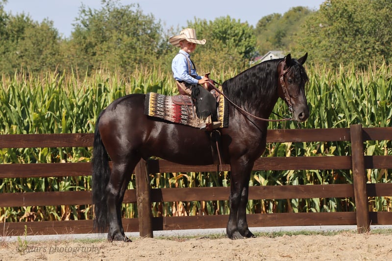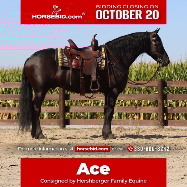 ♦️ 𝐭𝐡𝐞 𝐀𝐌𝐄𝐑𝐈𝐂𝐀𝐍 𝓕𝓪𝓵𝓵 𝓒𝓵𝓪𝓼𝓼𝓲𝓬 ♦️ Happening now thru MONDAY | OCTOBER 20th - Available EXCLUSIVELY on HorseBid's website! For more details and to register visit: www.Horsebid.com CONSIGNOR CONTACT: Hershberger Family Equine 330-600-8242 LOCATION: Sugarcreek, OH BREED: Friesian Sporthorse REGISTERED: Yes REGISTERED NAME: A-J'S Ace COLOR: Black HEIGHT: 15.3 AGE: 6 GENDER: Gelding If your looking for your very own plack beauty here is your guy!! Ace is 6yr. Old registered FSHR gelding. Standing at 15.3 hand tall. Ace is a true gentleman quiet, willing to please, safe and handsome. He has been with our family for the last 3 1/2yrs. He's been ridden western, English, bareback and brideless. He side pass to easily open and close gates. My 10 yr old and 6yr old kids get him out and rides him by themself. My kids will spend hrs playing with him from riding double, running around him chasing each other or simply enjoying a big horse they can canter around. He will walk, trot, canter and pick up both leads. Ace is easy to catch in the pasture, gets along well with others and is easy to Keep inside or outside. He stands great for the farrier, tacking up, grooming and baths. He will load on a taiter. Ace can be ridden in in groups, alone, on the road, open field, trails or arena. He has been ridden on Camping trips, in the dark and does well with a buddy seat.He will cross water, logs and conquers rough terrain with ease. Ace also does well in the carriage, been driven on State roads, through town and does great in traffic. He is up to date or on vaccine and dewormer. If Ace Sounds like the perfect fit for you, but you want to try him in person before contact Joanna to schedule a visit. You can also do a PPE if that is something you want to do.