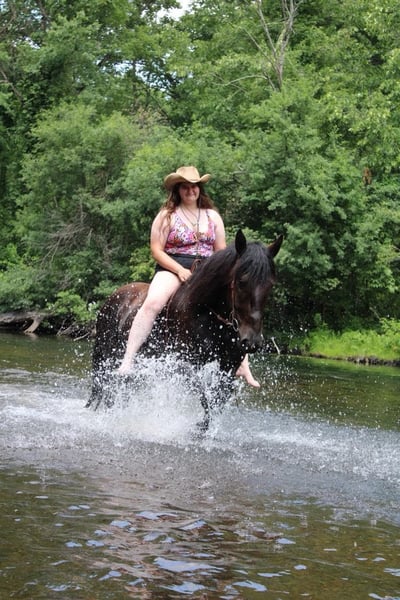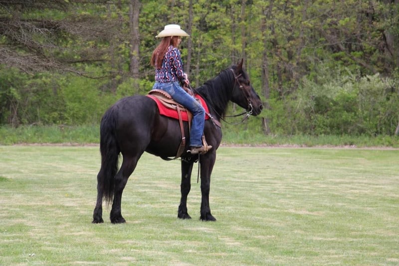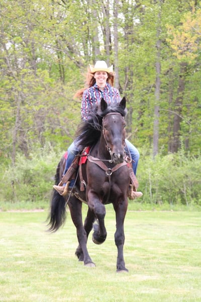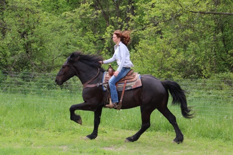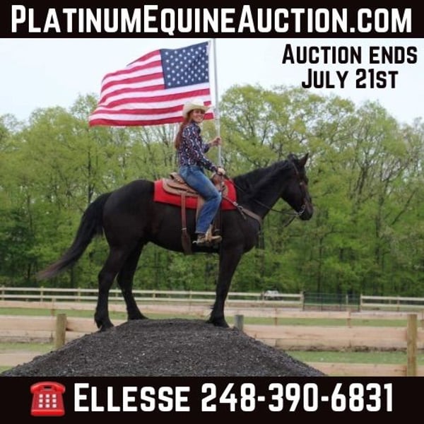 ONLINE AUCTION Place your bids at www.PlatinumEquineAuction.com Starting Bid $3500 Auction ends July 21st, 2024 Need a new saddle? Check out White Rock Saddles on our website or Facebook! I would like to introduce Prince!!! Prince is a 5 year old, 16.1hh, jet black lightly feathered stocky made Percheron Friesian cross gelding with a sweet little snip on his nose! This boy is broke to walk, trot, and canter but if you let him pick the pace it will stay slow and steady. His trot is one of the most elegant you will find and his canter is like sitting on a cloud. He’s soft in the mouth and has excellent breaks. Prince has had years of natural horsemanship training. He will walk, trot, and canter with no tack! He stays right in tune with his rider. He knows all the cool tricks, like how to sit and lay down on command. He has completed our desensitizing program with flying colors. He has competed in trail versatility classes under grandstand lights and handles the crowd and chaotic atmosphere like an old pro. We have been unable to actually spook him in any way. He trail rides in deep woods, open country, deep water, and steep terrain. He will not shy from traffic, kayaks, or bikes! Show him and let his grand kids show him in 4/H events. Prince is a love of a horse. Yes he loves people and other horses. He’s an easy keeper and easy going guy. Prince can happily live in a back yard or a busy barn he’s got that chill go with the flow attitude! He would make an excellent horse to enjoy the trails on or to teach new or inexperienced riders. He is one of the most popular crosses in the horse world and he comes with loads of experience. He plays well with all others outside and will greet you at the gait! He has no vices. Don’t let him slip through your fingers! Prince is a horse the entire family can enjoy! Please call or text Ellesse Schwartz at 248-390-6831 for more information. Birdie lives in Howell, MI 48855. ONLINE AUCTION Place your bids at www.PlatinumEquineAuction.com Starting Bid $3500 Auction ends July 21st, 2024 Need a new saddle? Check out White Rock Saddles on our website or Facebook!