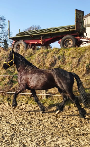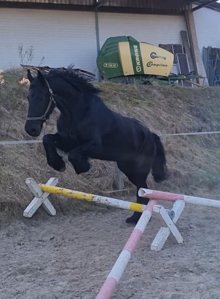 With a heavy heart, I must sadly part with my beloved partner in crime. He is a 9-year-old purebred Friesian gelding, standing at 173 cm. Frederico (affectionately called Freddy) is a reliable partner with whom you can do anything. He has excellent conformation and movement. No vices. He is familiar with children, farm life, dogs, and other animals. He knows both pasture and stable life (only overnight stays). He is herd-friendly and quickly makes new friends. He is a gentleman. Solo rides are always possible! Riding in a group is more fun, but riding alone is also good and relaxed. Freddy and I have participated in show jumping lessons, and he loves it! He has a few belongings he would like to bring to his new home. I wish him a truly wonderful home where he will be loved just as much as he was with me. Platz vor Preis.