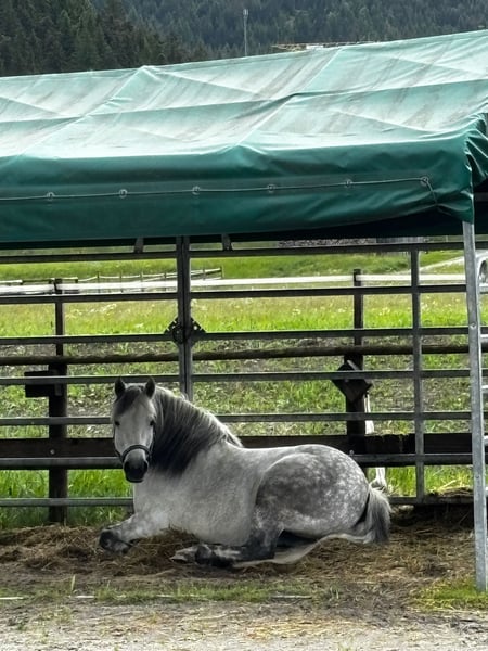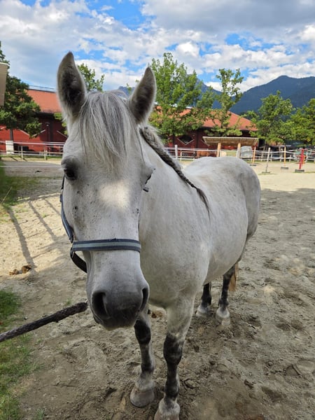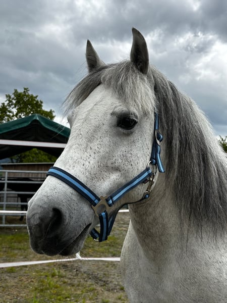 The beautiful eight-year-old Spanish pony mare Mariposa (approximately 140 cm tall) – affectionately called Marie by us – found her way to us in the horse shelter in the spring after her partner horse passed away. Upon her arrival, Marie was significantly overweight and was suffering from an extremely painful bout of laminitis. In the horse shelter, her feeding plan was adjusted, she received targeted pain therapy, and a specialized shoeing. Thanks to these measures, Marie is doing really well today – she is fit, lively, full of joy for life, and ready for the adventure of living! The delightful mare is very open, friendly, and has – typical for ponies – a good dose of cheeky charm. Marie is an absolute rough diamond and is looking for a horse-experienced, sensitive person by her side who will attend to her needs, guide her through life with loving consistency, and continue her training and development. She is familiar with working with a saddle and bridle on the lunge, loves to excel in groundwork, and enjoys exploring the area while out for walks. The mare wishes for people by her side who are well-versed in laminitis and have a farrier on hand who specializes in this condition. Marie will remain prone to laminitis, and therefore, special care is required when choosing her feed, flooring, and exercise. Otherwise, the pretty pony mare enjoys excellent health. She is fully vaccinated, microchipped, and dewormed. In the herd, she gets along well with both mares and geldings. Marie is preferably placed in an active stable; however, an open stable system or a night box with daily turnout is also conceivable.
