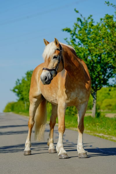 Wir suchen für unsere 12 Jährige Haflingerstute ein neues liebevolles Zuhause. Vroni ist reinerbig und von bester Abstammung. Sie ist ein sehr sportlicher Haflinger, zeigt sich unter dem Sattel sehr motiviert und hat Spaß an der Arbeit. Vroni springt sehr gut und hat daran besonders viel Freude, lässt sich aber auch in der Dressur gut reiten. Durch ihre Neugier lernt sie schnell, allerdings nicht nur gewünschte Dinge. Sie hat drei hervorragende Grundgangarten. Mit ihr wurde bisher vielseitig gearbeitet und diese Abwechslung (Bodenarbeit, Springen, Dressur, Longieren, Ausreiten) sollte sie auch in ihrem neuen Zuhause finden. Vroni kennt Kinder, Hunde, Wasser, Traktoren etc. und ist im Gelände umgänglich und gut zu händeln. Sie ist nicht ängstlich, aber dennoch auch nicht unerschrocken. Sie ist geeignet für Freizeit- und Turnierreiter, sollte aber weiter gefordert und gefördert werden. Nur ein bis zweimal die Woche bewegt zu werden, genügt ihr nicht. Gehalten wird sie im Offenstall (24/7 Koppel mit Unterstand), Vroni ist also auch herdenverträglich. Diese Haltungsform wäre für das neue Zuhause auch wünschenswert. Sie ist regelmäßig geimpft und entwurmt und auch die Zähne wurden regelmäßig gemacht. Aktuell ist sie komplett beschlagen. Probereiten gegen Schutzgebühr möglich.