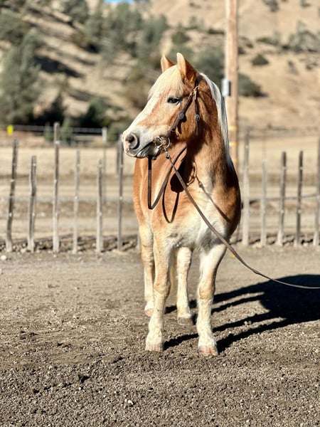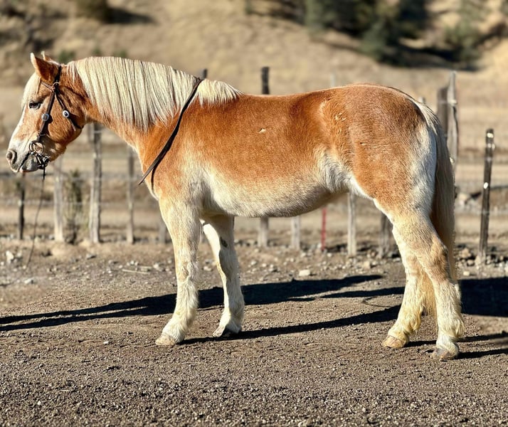 ONLINE AUCTION Place your bids at www.PlatinumEquineAuction.com Starting Bid $3500 Auction ends December 15th, 2024 Need a new saddle? Check out White Rock Saddles on our website or Facebook! Darla is a 12yr old Haflinger mare. She stands about 14.3HH and is stout with a thick build. Darla has been used as a trail horse most her life as well as a cart pony. She drives single and has been drove down streets. Darla has that gentle deamor that Haflinger are known for! She doesn’t get startled by anything and is always excited to see her person. Darla goes down any trail, crowded streets and dark forests. For riding, she has a nice and easy rein, good stop and reverse and has a more athletic movement. She is a say to get into higher gaits, and has pretty circles and floats around beautifully. I could see her going into the English world with her movements! She has a slower steady pace but keeps up with the pack as well. She stands quietly for tacking up and bathing. She is the easiest horse to clip, brush and pick her feet up. She isn’t “marish” and can be stalled or turned out with other horses. Darla isn’t spooky, has no bolt, buck or bite and can be patient with new riders. She is easy to handle and safe as the day is long. She is familiar with all things nature and farm, like barking dogs, loud vehicles, and chaotic commotion. Darla is one you can count on to stay safe and gentle is any situation. Come see Darla in Bitterwater, CA or call Cheyenne Rey for more information about her, at 831-537-8746. ONLINE AUCTION Place your bids at www.PlatinumEquineAuction.com Starting Bid $3500 Auction ends December 15th, 2024 Need a new saddle? Check out White Rock Saddles on our website or Facebook!