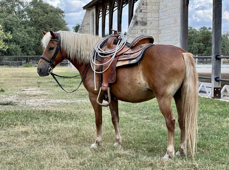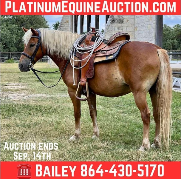 ONLINE AUCTION Place your bids at www.PlatinumEquineAuction.com Starting Bid $3500 Auction ends September 14th, 2025 Need a new saddle? Check out White Rock Saddles on our website or Facebook Buster is a 10 year old, 13H, Halflinger that’s up for the job. Whether it’s sorting cows, going for a trail ride or helping you train a young horse how to pony. He pulls a cart, attended parades and loves kids too. Buster is the same after a month off as he is after being ridden all the time. He’s wide enough to take up the leg of any size rider. He stands 13 hands tall. The rider in the video is 5’10” and rides him comfortably. He gets real joy out of trail riding and doesn’t mind going alone. He thinks cows and exotics are great and loves to be around them. Buster is good in the turnout with other horses or alone. He is currently barefoot. Contact at 864-430-5170 with any questions. Located in Canyon Lake, TX. ONLINE AUCTION Place your bids at www.PlatinumEquineAuction.com Starting Bid $3500 Auction ends September 14th, 2025 Need a new saddle? Check out White Rock Saddles on our website or Facebook
