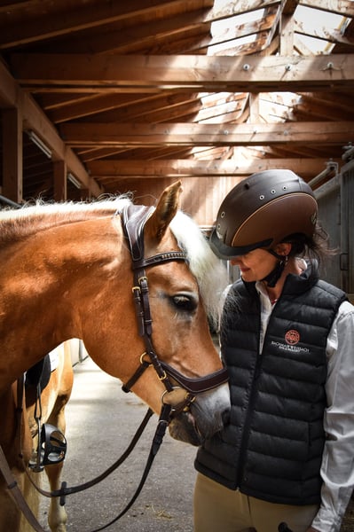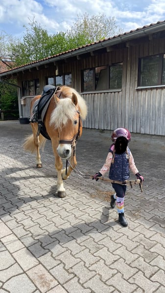 Notre hongre Haflinger, Schach, fait partie intégrante de notre petite école d’équitation depuis deux ans. Grâce à sa bonhomie et à son caractère, il convainc à chaque fois et rend de nombreux enfants et adultes heureux. Nous avons délibérément décidé de rechercher une nouvelle famille pour nos chevaux d’école après environ 2 à 3 ans. Schach monte 4 à 5 jours par semaine pendant environ une heure dans le cadre de l’école et est le partenaire idéal pour les enfants, les débutants comme pour les cavaliers plus avancés. Schach a été approuvé et a passé la inspection de performance pour étalons. Il est formé en dressage jusqu’à un niveau **A**, et montre un potentiel évident pour le niveau L. En saut d’obstacles, il se déplace avec assurance et clairvoyance jusqu’au niveau **A**, toujours attentif et motivé. Il a démontré sa calme et sa motivation lors de compétitions de saut en concours de cavaliers, où il a obtenu de nombreux classements. En extérieur, Schach est sage, calme et se montre toujours fiable. Nous pouvons envisager Schach aussi bien pour des cavaliers en reprise que pour une équipe mère-enfant. Même les cavaliers expérimentés prendront beaucoup de plaisir avec lui. Il est habitué à la pension box avec sortie quotidienne au paddock. Schach est un cheval de rêve en qui on peut avoir 100 % confiance. Il mérite une personne de référence à qui il pourra montrer chaque jour tout ce qu’il a à offrir.