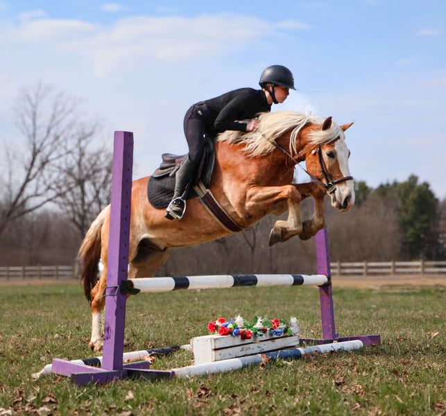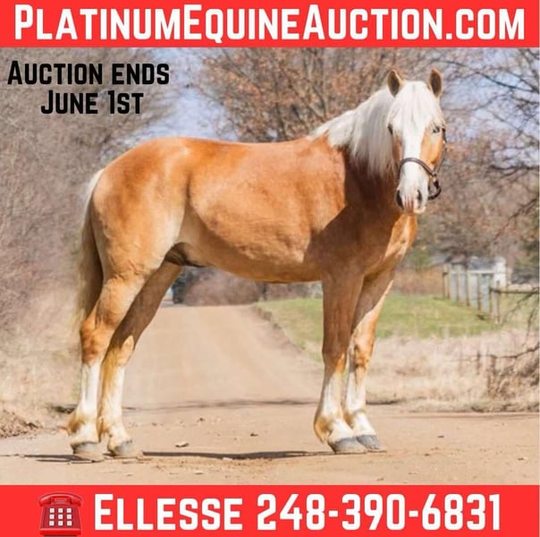 ONLINE AUCTION Place your bids at www.PlatinumEquineAuction.com Starting Bid $3500 Auction ends June 1st, 2025 Need a new saddle? Check out White Rock Saddles on our website or Facebook! Meet Duke as we call him! Here’s a registered haflinger that will be hard to beat. With his double mane and long blonde tail he’s as pretty as you would expect, if a horse with his pedigree. Duke is a registered American Haflinger gelding who stands 14.1hh at 4 years old. He is beautifully bred with MIDAS TOUCH and NEIMAN MARCUS on his papers. You’ll put a lot of miles on your truck to find one like him. He’s solid and very dependable. He has nice sporty conformation. Duke walk trot and canters with ease. Duke knows both her leads and has great transitions both upward and downward. All of his gaits are smooth and comfy. Duke has a heart of gold and aims to please every time. He has a quiet with a go with the flow temperament. He has recently started over fences and is a natural at jumping. He holds a slow and steady canter to the jumps. Duke is currently jumping 2ft but he has potential to jump 2’6”. Duke also rides western and trail rides like a dream. He is confident out in the woods. While you’re riding out alone or in a group Duke is always down for a trail ride. Duke is not the spooky type, not much phases him. He has been hauled to different state and metro parks in Michigan, Ohio, and Indiana. He has seen the sites and has all the experience. Duke is also broke to drive. He pulls a cart or buggy and is easy to drive around. On the ground he is patient and respectful. He likes people and loves to show off his personality! Duke even lays down on command! He stands for mounting/dismounting, grooming, and bathing. Duke plays well with other horses and he is an easy keeper! Duke is overall so sweet and very willing! He is smart and learns new things quickly. Duke is an all around girl. He is great for kids and adults on the ground and undersaddle. Please contact Ellesse Schwartz at 248-390-6831 for more information. He is Located in Howell, Michigan 48855. ONLINE AUCTION Place your bids at www.PlatinumEquineAuction.com Starting Bid $3500 Auction ends June 1st, 2025 Need a new saddle? Check out White Rock Saddles on our website or Facebook!