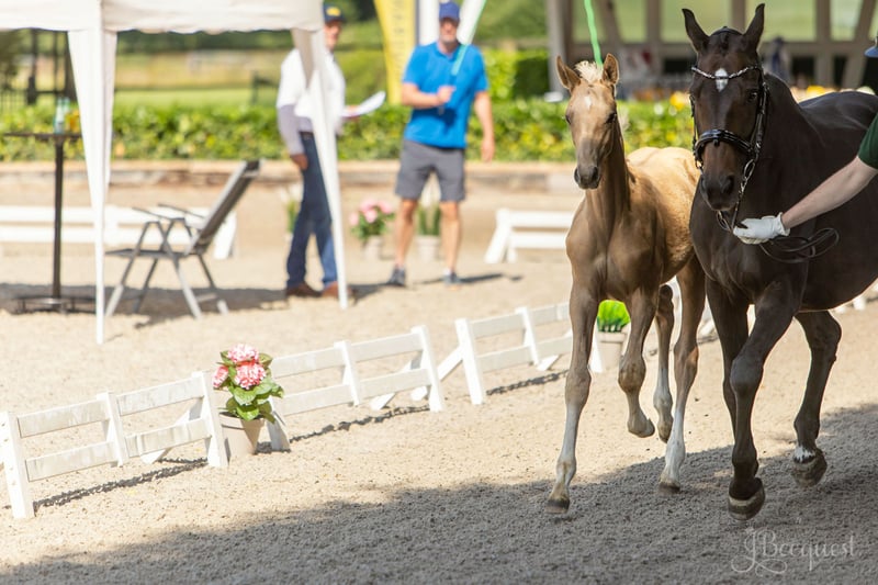 Quinario B Qandide x Bonifatius x Londonderry Wij bieden onze jaarling hengstveulingen Quinario te koop aan. Hij is geboren op 25 maart 2025. Door zijn vader is hij een zeer knap, licht palomino met een lange benen, een krachtige galop, uitstekende draf en sterke stap. Op de veulenschau werd hij uitgeroepen tot reservekampioen. Quinario is zeer zelfstandig en absoluut onbevreesd. Bierbikes op straat, lage heteluchtballonnen, vuurwerk en muziekkorpsen maken hem niet uit. Vanaf de eerste week oefenen we met de veulens het veulenkamp, zodat alle onze veulens bij de verkoop halstert, gewend zijn aan de trailer, de smid en de dierenarts. Ze maken kennis met alle dagelijkse geluiden op de boerderij en kennen honden. Onze merries met veulens grazen in de zomer samen op 2,5 hectare weiland, dag en nacht. In de herfst en winter zijn ze 10-12 uur overdag buiten, met 24/7 hooi, ’s nachts in grote geboorteboxen. Zo groeien de veulens mooi op en wennen ze meteen aan alle weersomstandigheden en temperaturen. Hij is het vijfde veulen van zijn moeder. Beautiful Mind 8 is een zeer elegante, mooie Staatsprämienkandidate uit de merriestam van Juggema. Ze is donkerbruin en ongeveer 1,68 m hoog. Haar eerste veulen, een voshengst van Goldberg, werd direct na de geboorte verkocht. Haar tweede veulen, een voshengst van Despacito, ging via de Elite Hannoveraanse Veiling naar Spanje. Haar derde veulen, uit Franziskus, werd gekroond en bevindt zich momenteel in de opleiding van haar ruiter. Dit is via Instagram te volgen. Haar vierde veulen, Felisa, is bij ons en kan zeker worden bekeken. Beauty is ontzettend knuffelig en goedmoedig en geeft dit slimme, fantastische type altijd door aan haar veulens. Beauty is, zoals al onze merries, getest en WFFS-negatief. Merriestam: Grafitti v. Graf Top (DRE: S** - succesvol met Elisabeth Beneke-Backhaus); Saphir v. Sunlight xx (VS: internationaal CIC*** - succesvol met Gerd-Olaf Neuberg); Dorian Gray v. Don Picardi (VA 2009: €47.000, DRE: S* - succesvol met Katrin Alkenings); gekeurde hengst Desperados FRH v. De Niro (VA 2003: €104.000, individueel brons en teamgoud op de Olympische Spelen Dressuur 2016 met Kristina Bröring-Sprehe); Don Diego v. Don Frederico (VA 2007, DRE: internationaal GP - succesvol met Juan Pablo Matute Guimon); gekeurde hengst Don Noblesse v. Dancier (DRE: internationaal GP - succesvol met Susan Pape); Weneziano v. Wolkenstein II (DRE: internationaal GP - succesvol met Martina Steisslinger); Akrobat v. Acord II (SPR: internationaal 1,40 m - succesvol met Philipp Ulrich). De vader, Qandide, is een mooie cremello hengst die zijn rustige en ontspannen aard doorgeeft aan zijn veulens. We hebben al een veulen van hem uit een andere merrie en kunnen duidelijke overeenkomsten zien. Ze lijken erg op elkaar in hun kalme en ongestoorde aard. Qandide is ECVM- en WFFS-negatief. Meer informatie over hem is te vinden op https://www.hengste-rohmann.de/qandide. Wij hechten veel waarde aan goede verzorging en transparantie, daarom kunnen geïnteresseerden een dagelijkse blik in onze fokkerij krijgen via Instagram. Q kan natuurlijk ook bij ons worden bezocht en bekeken. Een actueel bewegingsfilmpje kan worden gemaakt en op aanvraag worden toegestuurd. Op de laatste foto's zijn de moeder en de eerdere nakomelingen te zien. Hij staat nog bij ons, maar zal binnenkort verhuizen naar een eersteklas fokkerij. De plek kan indien gewenst worden overgenomen. Bij interesse of vragen kunt u contact met ons opnemen via bericht, WhatsApp of telefoon. Telefoon: +49 152 53765924