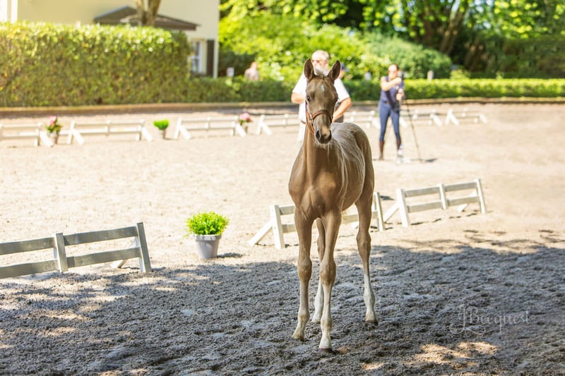 Quinario B Qandide x Bonifatius x Londonderry Zum Verkauf steht unser Hengstfohlen Quinario aus diesem Jahr. Er wurde am 25.03.2025 geboren. Aufgrund seines Vaters, ist er ein sehr schicker heller Palomino. Sehr Lange Beine, einen schwungvollen Galopp, herausragenden Trab und starken Schritt. Auf der Fohlenschau wurde er deswegen als Reservesieger prämiert. Quinario ist sehr selbstständig und absolut unerschrocken. Bierbikes an der Straße, tief fahrende Heißluftballons, Feuerwerk und Musikkapellen tangieren ihn nicht. Ab der ersten Woche üben wir das Fohlen ABC, somit sind alle unsere Fohlen bei Abgabe halfterführig, verladefromm, kennen den Schmied und Tierarzt. Sie lernt alle täglichen Geräusche auf dem Hof kennen und kennen Hunde. Unsere Stuten mit Fohlen laufen im Sommer zusammen auf 2,5ha Weide, Tag und Nacht. Im Herbst und Winter sind sie 10-12h tagsüber draußen mit 24/7 Heu und nachts in großen Geburtsställen. Somit wachsen die Fohlen sehr schön auf und gewöhnen sich direkt an alle Wetterarten und Temperaturen. Er ist das fünfte Fohlen seiner Mutter. Beautiful Mind 8 ist eine sehr elegante schöne Staatsprämien Anwärterin aus dem Stutenstamm der Juggema. Sie ist dunkelbraun und ca 168cm groß. Ihr erstes Fohlen ein Rapphengst von Goldberg wurde direkt nach der Geburt verkauft. Ihr zweites Fohlen ein Rapphengst von Despacito ging über die Elite Hannoveraner Auktion nach Spanien. Ihr drittes Fohlen aus Franziskus, wurde prämiert und befindet sich aktuell in der Ausbildung seiner Reiterin. Er kann über Instagram verfolgt werden. Und ihr viertes Fohlen Felisa, ist bei uns und kann sich gerne angeschaut werden. Beauty ist wahnsinnig verschmust und gutmütig und vererbt diesen tollen intelligenten Typ immer an ihre Fohlen weiter. Beauty ist wie alle unsere Stuten getestet und WFFS negativ. Stutenstamm: Grafitti v. Graf Top (DRE: S**-erfolgr. mit Elisabeth Beneke-Backhaus); Saphir v. Sunlight xx (VS: int. CIC***-erfolgr. mit Gerd-Olaf Neuberg); Dorian Gray v. Don Picardi (VA 2009: 47.000 €, DRE: S*-erfolgr. mit Katrin Alkenings); gek. Hengst Desperados FRH v. De Niro (VA 2003: 104.000 €, Einzelbronze u. Teamgold Olympische Spiele Dressur 2016 mit Kristina Bröring-Sprehe); Don Diego v. Don Frederico (VA 2007, DRE: int. GP-erfolgr./Bronzemed. EM U25 2016 mit Juan Pablo Matute Guimon); gek. Hengst Don Noblesse v. Dancier (DRE: int. GP-erfolgr. mit Susan Pape); Weneziano v. Wolkenstein II (DRE: int. GP-erfolgr. mit Martina Steisslinger) Akrobat v. Acord II (SPR: int. 1,40 m- erfolgr. mit Philipp Ulrich). Der Vater Qandide ist ein schöner Cremello Hengst, der seine ruhige gelassene Art an seine Fohlen weiter gibt. Wir hatten bereits ein Fohlen von ihm aus einer anderen Stute und können ganz klare Parallelen ziehen. In ihrer gelassenen und nichts aus der Ruhe bringenden Art sind sie sich sehr ähnlich. Qandide ist ECVM und WFFS frei. Mehr Informationen zu ihm unter https://www.hengste-rohmann.de/qandide Uns ist eine gute Aufzucht und Transparenz sehr wichtig, daher kann man einen täglichen Einblick in unsere Zucht bei Instagram bekommen. Q kann aber natürlich auch gerne bei uns besucht und angeschaut werden. Ein aktuelles Bewegungsvideo kann gemacht werden und wird gerne auf Anfrage verschickt. Auf den letzten Bildern ist die Mutter sowie bisherige Nachzucht zu sehen. Er steht noch bei uns, wird jedoch bald in eine erstklassige Aufzucht umziehen. Der Platz könnte mit übernommen werden bei Bedarf. Bei Interesse oder Fragen können Sie uns gerne per Nachricht, Whats App oder Telefon kontaktieren. Telefon: +49 152 53765924