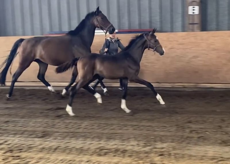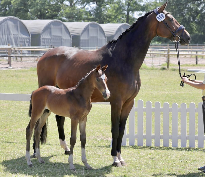 Stunning colt by Bon Esprit out of a strongly movemented mare by Rock Springs (Rock Forever) x Beluga (Brentano II). The foal has mastered the basics and is kept in a small colt group in a loose box, being led daily on a halter to and from the paddock. At the foal inspection, he immediately showed his potential, earning him the Gold Premium from the Hanoverian Verband. The judges described him as a "very noble and well-formed colt," which fits him perfectly. He is characterized by powerful movement, striking appearance, and most of all, his dream-like temperament.
