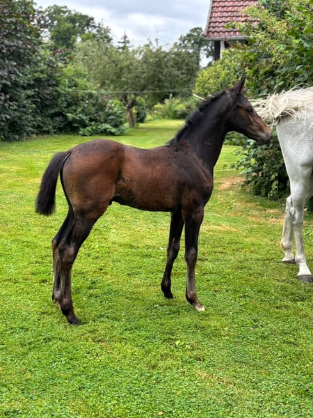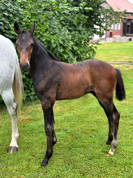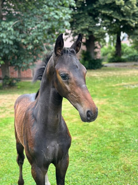 Typy and very long-legged colt with good movements and an excellent pedigree. The sire is the Oldenburg stallion Conkanno PS (Conthargos x Chacco Blue). The dam, Hann Pr.St. Biscaya, achieved an above-average mare performance test and was awarded at the show. Score for free jumping: Manner 9.0 Ability 10.0 She herself was successful in sport up to 1.10m. Her first foal is successful in sport at CCI3* level. Please contact exclusively through the breeder: Lars Müller: 01717234252