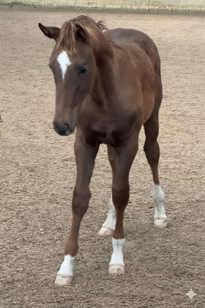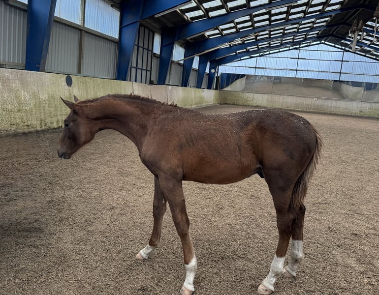 Dark Chestnut, 4x white markings, colt, yearling for the grand arena by Fidertanz Outstanding presence and a fabulous character! If you are looking for a beautiful, typy, uphill-built foal, this is a movement-rich colt for sale. He is equipped with excellent conformation, has a charming head with a beautiful, well-set neck, and is built very uphill with long, elegant legs. Overall, a modern, sporty foal with a fantastic hind leg—simply a dream. Very well-behaved, personable, and familiar with basic foal training. A wonderful temperament. The dam has already gifted me many fantastic foals, many of which are still in my possession. Unfortunately, I have to part with this wonderful foal now, as I simply have too many horses. No emergency sale! Siblings, presented by me as a better leisure rider, have achieved success up to M level. Full siblings aged 3, 4, and 5 years are available for viewing! The dam is a Warkant x Don Cavallo, a ZfdP State Premium mare with three top gaits. The sire of this colt is the top breeding stallion Fidertanz. I need not say much about him—he is renowned for his movement, rideability, and character. The internet is full of reports about him and his successful progeny, including numerous licensed sons. The pairing of this mare and stallion is simply perfect. I was so impressed with the foals from this cross that I have repeated the pairing for the fourth time. All of them are fantastic. The siblings can all be viewed. The colt is regularly handled by the blacksmith, dewormed on schedule, and receives high-quality mineral feed. If you value a well-raised foal, with good horse sense and proper care, this is the right place for you to find a new home for him. If I have sparked your interest with this promising future star, please feel free to contact me. I look forward to meeting you and introducing you to this young gentleman.