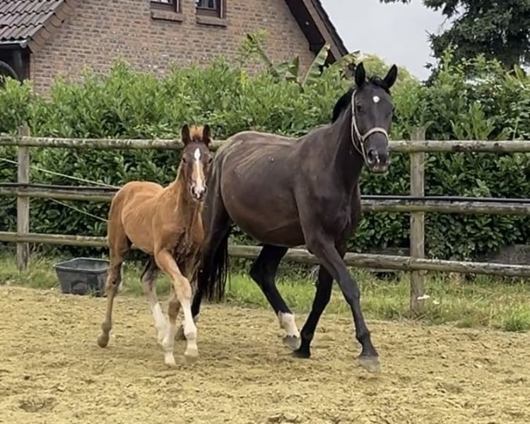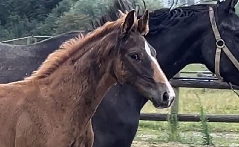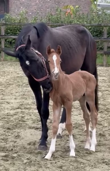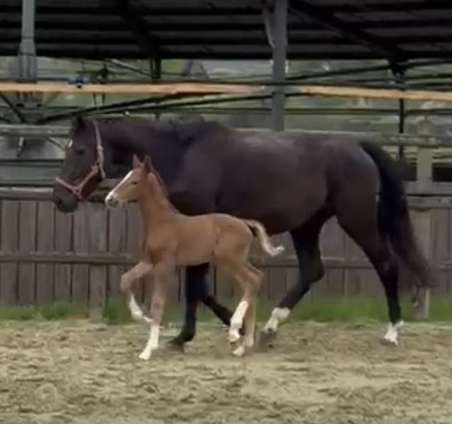 The little son of Bon Esprit out of a Secret x Bretano II mother wants to follow in the footsteps of his ancestors. Already equipped with momentum and energy, he will surely dance through the big arena one day. A dark bay with 4 white markings and correct conformation draws attention. The mare may also be for sale.