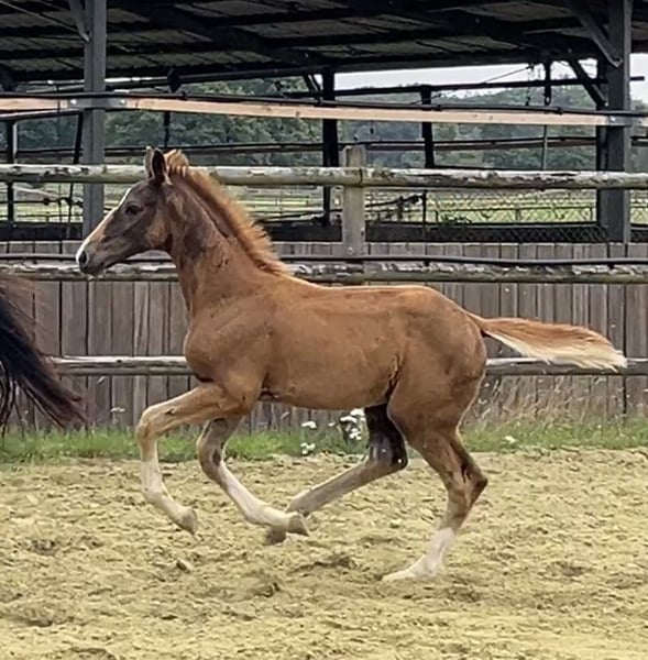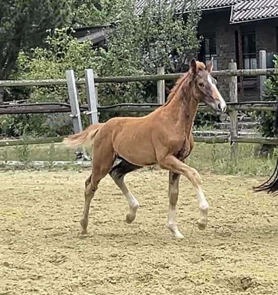 Der kleine Sohn von Bon Esprit aus einer Secret x Bretano II Mutter, möchte in die Fußstapfen seiner Vorfahren. Jetzt schon mit Schwung und Elan ausgestattet, wird er sicherlich mal durch das große Viereck tanzen. Ein Dunkelfuchs mit 4x weiß und korrektem Fundament zieht die Blicke auf sich. Ggf. steht auch die Stute zum Verkauf.
