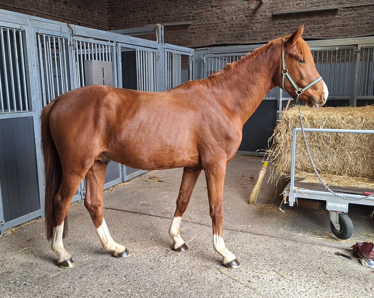 Dieser auffällig hübsche, selbstgezogene Junghengst, geboren 2023, von San to Alati aus einer Stute von Governor (Totilas) x United sucht ein neues Zuhause. Er bewegt sich sehr gut und schwungvoll, ist brav, umgänglich und nervenstark. Sein derzeitiges Stockmaß beträgt etwa 1,62m. Er wuchs in einer kleinen Herde mit einem weiteren gleichaltrigen Hengst und zwei jungen Wallachen auf. H Hufe auskratzen, putzen und führen sind für ihn selbstverständlich. In der Halle läuft er schon recht sicher auf Kommando in den einzelnen Grundgangarten. Wir geben ihn ab, da wir denken, dass er für den großen Sport hinten zu weich gefesselt ist. Daher braucht er eine schonende Ausbildung und einen neuen Möhrchengeber, der eher freizeitmäßig oder im unteren Dressurlevel unterwegs sein möchte und ein wenig mehr Zeit für die Ausbildung dieses charmanten Junghengstes investieren möchte. Sein Preis liegt bei 5000,- €, keine Händler!