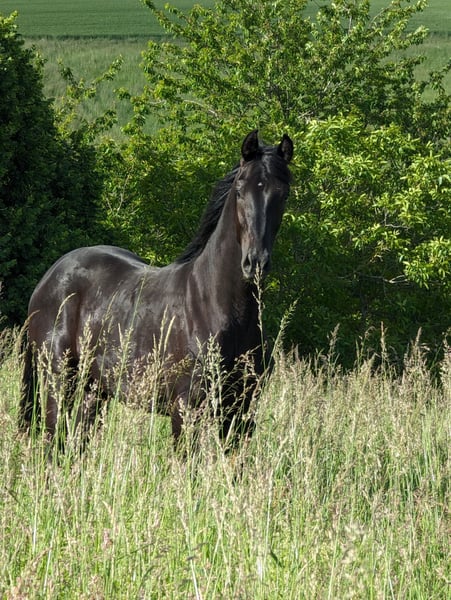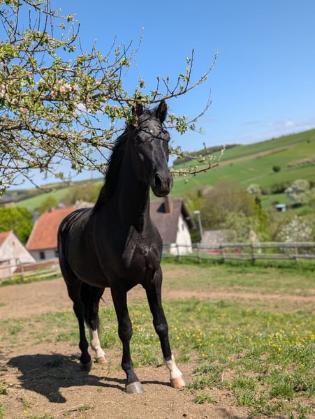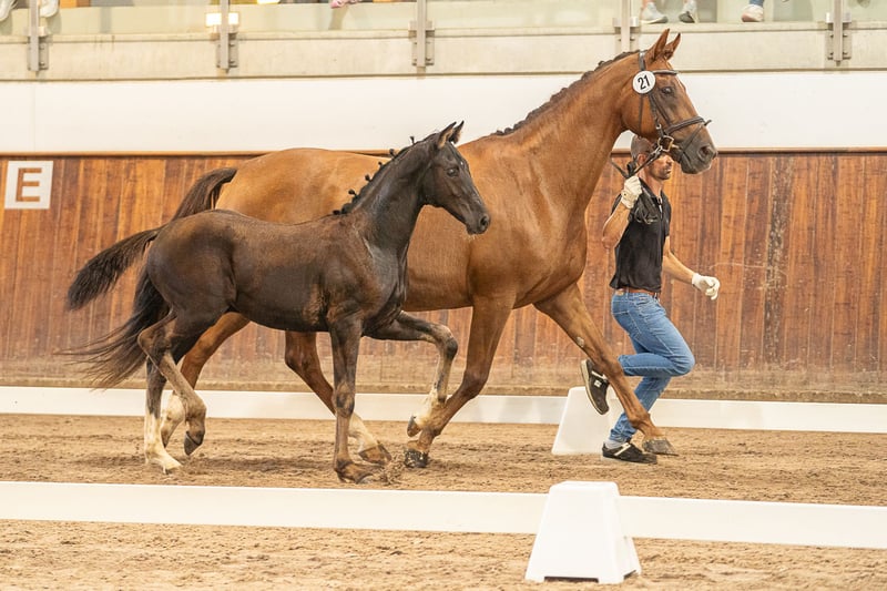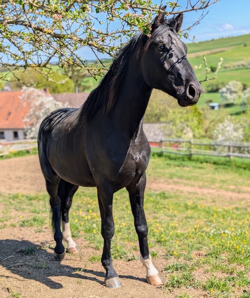 Dieser elegante Rappe sticht nicht nur durch sein ansprechendes Erscheinungsbild hervor, sondern auch durch seine herausragende Abstammung.