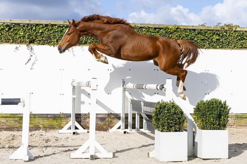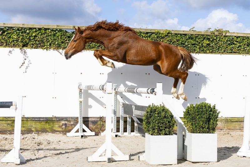 Velvet is a very attractive chestnut with a nice type and a strong model. He is well built uphill and has a strong hindquarter. He is quick off the ground, shows carefulness and demonstrates a good way of jumping. A horse with a strong engine. He moves well, has a very good trot and a good canter. A complete sport horse with quality, expression and scope. Sire Viscerado competes at 1.45m level and is a son of Viscount (1.40m), from the Valentino line. A stallion that passes on sport, scope and mentality. Dam Upsalla is a daughter of Uccello (1.40m) and comes from a versatile family with both showjumping and dressage horses at a high level. The damline is strong with performances in both disciplines: Contaro – 1.45m Charnel – 1.40m Burschi – 1.35m Cover Girl – 1.60m Enzo Evado – 1.40m First Class – Grand Prix dressage Frankie – Grand Prix dressage winner Da Vincerico – Grand Prix dressage Priceless – Inter II A family with proven quality in both jumping and dressage.