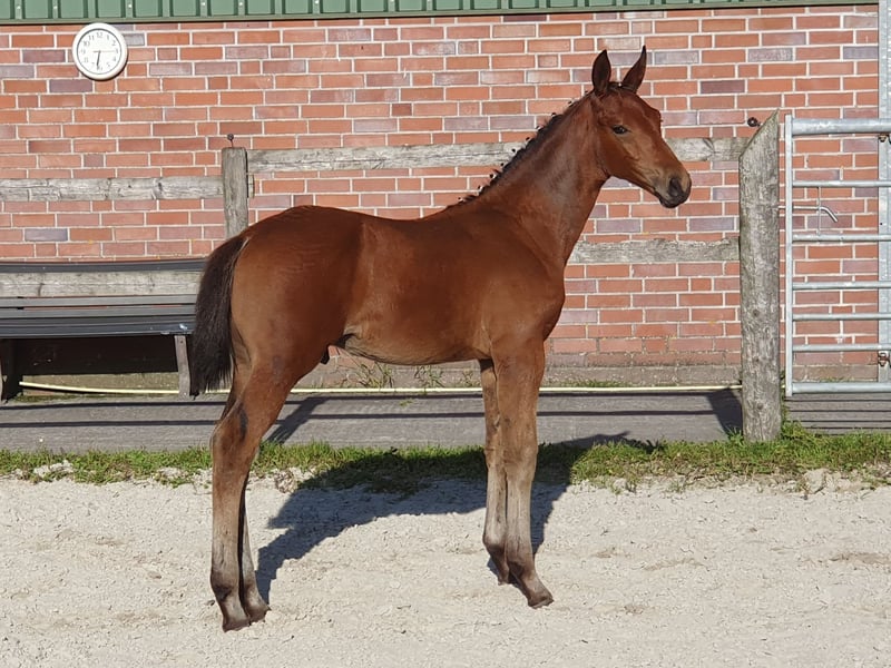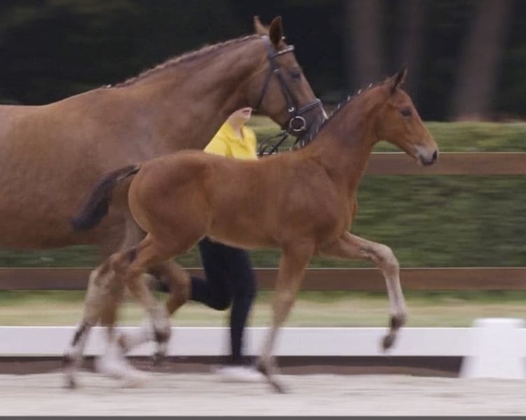 For sale is our promising colt "Encanto," born on June 7, 2025. This elegant bay impresses with his correct conformation and balanced temperament. He demonstrates three good basic gaits and is very vigorous. Encanto already shows a lot of potential for dressage and is suitable for both competition sports and higher-level leisure riding. He is people-oriented, has a rather calm, balanced temperament, and a friendly character. His sire is the Bundeschampion and HLP record winner Escanto PS. Encanto's dam, the Hanoverian premium mare Bella Bionda, successfully completed her mare performance test at the age of three with scores of 7.5 for trot, 8.0 for canter, 7.5 for walk, and 8.0 for rideability. If you are interested or would like more information, please feel free to contact me. Viewings are possible by appointment.