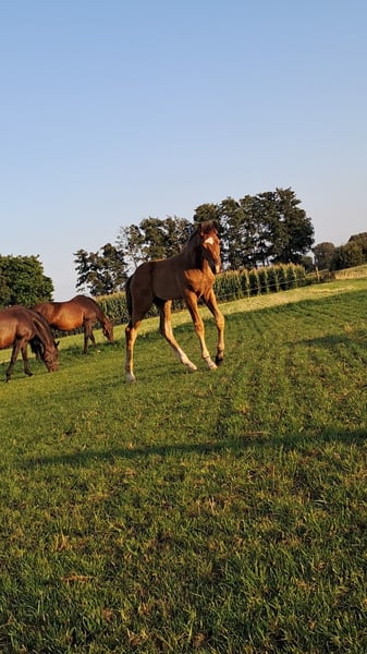 Ein bewegungsstarkes, edel aufgemachtes Hengstfohlen von Bon Courage aus einer Mutter von De Niro x Sandro Hit x Florestan. Das Fohlen besticht durch sein korrektes Exterieur, viel Ausdruck und einen kraftvollen, elastischen Bewegungsablauf. Die leistungsstarke Abstammung verspricht beste Voraussetzungen für eine erfolgreiche Karriere im Dressursport. Bei der Fohlenschau erhielt es für Typ und Gesamteindruck zwei mal die Note 9,5, was seine besondere Qualität und Präsenz unterstreicht. Die Großmutter Serafine war Klassensiegerin auf der Stutenschau in Bruchhausen-Vilsen und Teilnehmerin der Herwart von der Decken-Schau, was die außergewöhnliche züchterische Qualität dieser Mutterlinie eindrucksvoll belegt.
